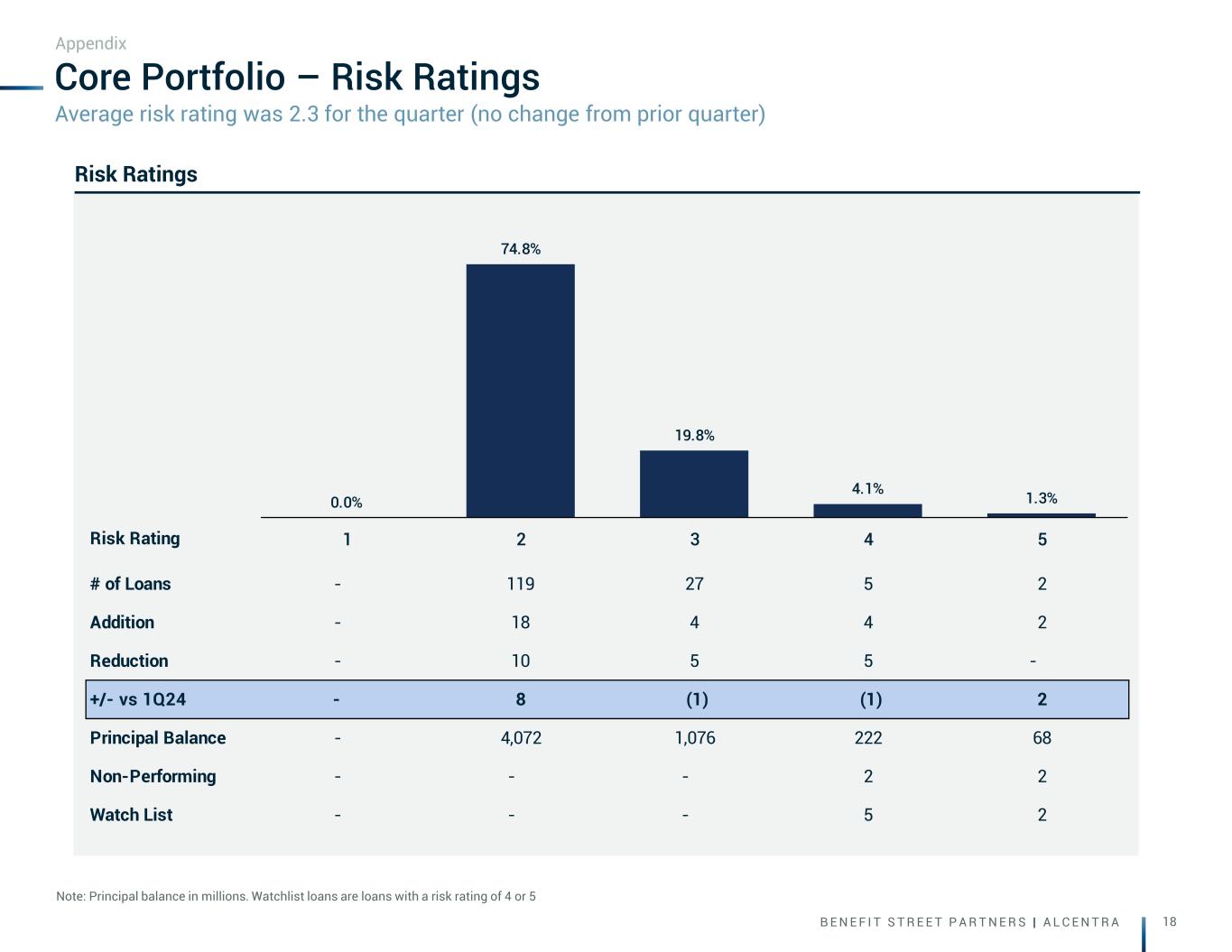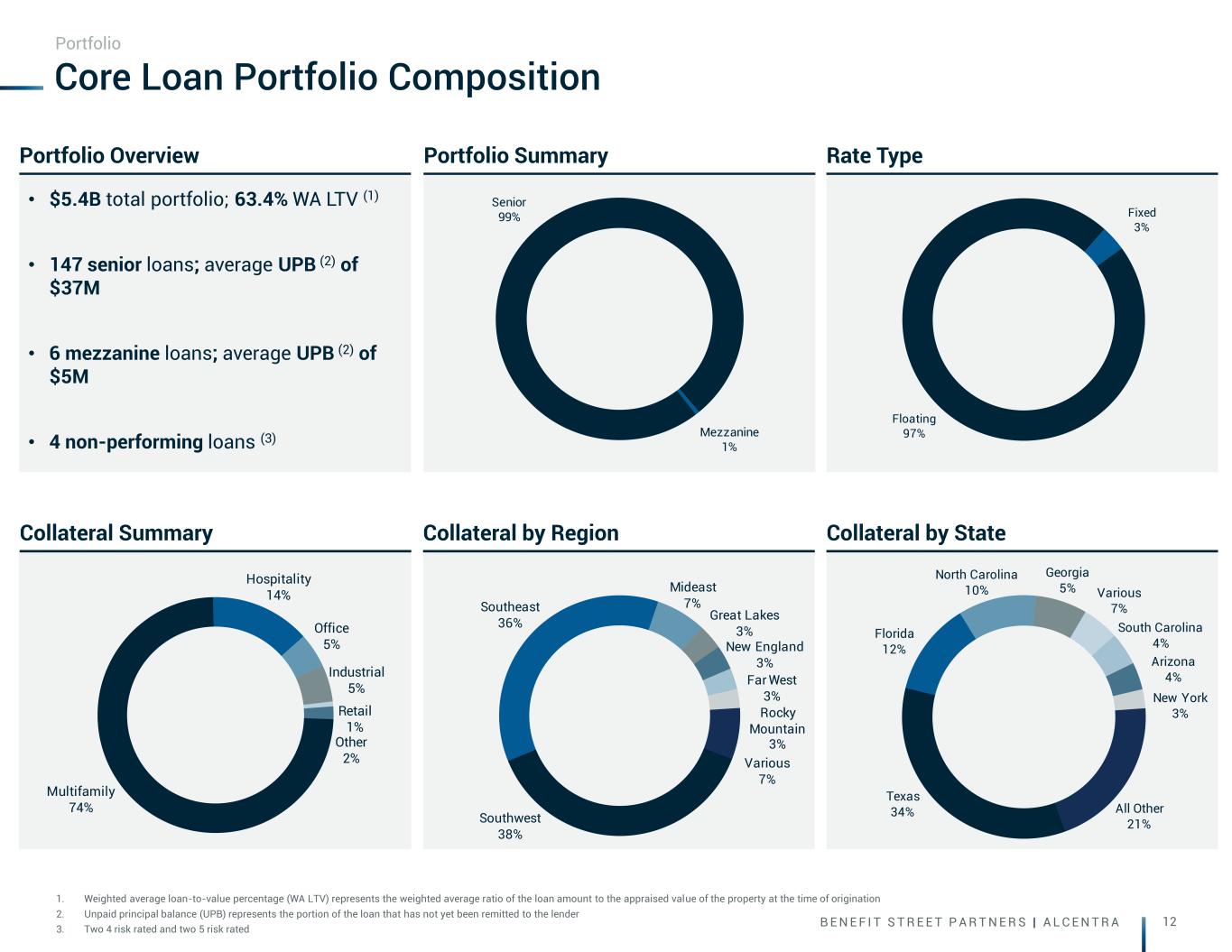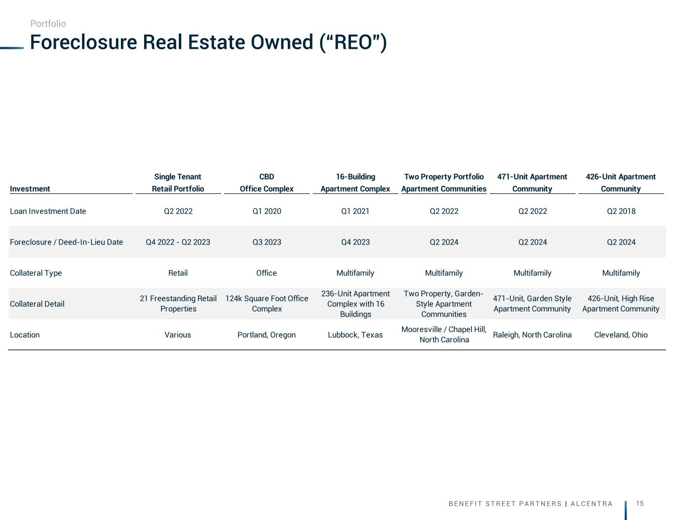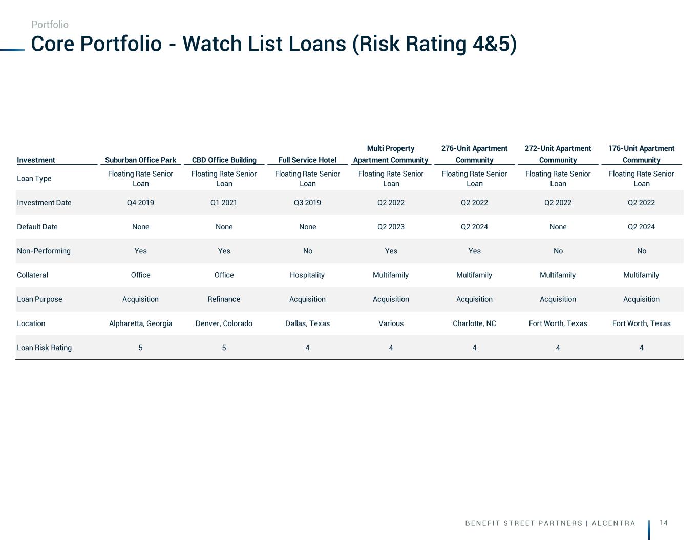 B E N E F I T S T R E E T P A R T N E R S | A L C E N T R A 14 Core Portfolio - Watch List Loans (Risk Rating 4&5) Portfolio Investment Suburban Office Park CBD Office Building Full Service Hotel Multi Property Apartment Community 276-Unit Apartment Community 272-Unit Apartment Community 176-Unit Apartment Community Loan Type Floating Rate Senior Loan Floating Rate Senior Loan Floating Rate Senior Loan Floating Rate Senior Loan Floating Rate Senior Loan Floating Rate Senior Loan Floating Rate Senior Loan Investment Date Q4 2019 Q1 2021 Q3 2019 Q2 2022 Q2 2022 Q2 2022 Q2 2022 Default Date None None None Q2 2023 Q2 2024 None Q2 2024 Non-Performing Yes Yes No Yes Yes No No Collateral Office Office Hospitality Multifamily Multifamily Multifamily Multifamily Loan Purpose Acquisition Refinance Acquisition Acquisition Acquisition Acquisition Acquisition Location Alpharetta, Georgia Denver, Colorado Dallas, Texas Various Charlotte, NC Fort Worth, Texas Fort Worth, Texas Loan Risk Rating 5 5 4 4 4 4 4