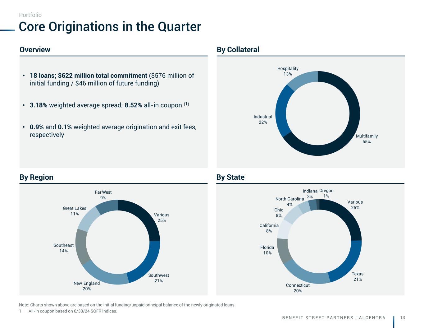 B E N E F I T S T R E E T P A R T N E R S | A L C E N T R A 13 Multifamily 65% Industrial 22% Hospitality 13% By State By Collateral By Region Core Originations in the Quarter Note: Charts shown above are based on the initial funding/unpaid principal balance of the newly originated loans. 1. All-in coupon based on 6/30/24 SOFR indices. Portfolio • 18 loans; $622 million total commitment ($576 million of initial funding / $46 million of future funding) • 3.18% weighted average spread; 8.52% all-in coupon (1) • 0.9% and 0.1% weighted average origination and exit fees, respectively Overview Various 25% Southwest 21% New England 20% Southeast 14% Great Lakes 11% Far West 9% Various 25% Texas 21% Connecticut 20% Florida 10% California 8% Ohio 8% North Carolina 4% Indiana 3% Oregon 1%