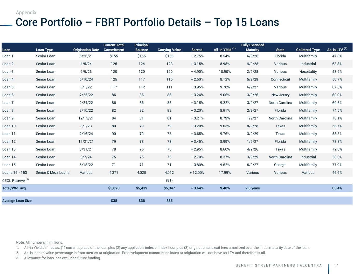 B E N E F I T S T R E E T P A R T N E R S | A L C E N T R A 17 Core Portfolio – FBRT Portfolio Details – Top 15 Loans Note: All numbers in millions. 1. All-in Yield defined as: (1) current spread of the loan plus (2) any applicable index or index floor plus (3) origination and exit fees amortized over the initial maturity date of the loan. 2. As-is loan to value percentage is from metrics at origination. Predevelopment construction loans at origination will not have an LTV and therefore is nil. 3. Allowance for loan loss excludes future funding Appendix Loan Loan Type Origination Date Current Total Commitment Principal Balance Carrying Value Spread All-in Yield (1) Fully Extended Maturity State Collateral Type As-is LTV (2) Loan 1 Senior Loan 5/26/21 $155 $155 $155 + 2.75% 8.54% 6/9/26 Florida Multifamily 47.8% Loan 2 Senior Loan 4/5/24 125 124 123 + 3.15% 8.98% 4/9/28 Various Industrial 63.8% Loan 3 Senior Loan 2/9/23 120 120 120 + 4.90% 10.90% 2/9/28 Various Hospitality 53.6% Loan 4 Senior Loan 5/10/24 125 117 116 + 2.50% 8.12% 5/9/29 Connecticut Multifamily 50.7% Loan 5 Senior Loan 6/1/22 117 112 111 + 3.95% 9.78% 6/9/27 Various Multifamily 67.8% Loan 6 Senior Loan 2/25/22 86 86 86 + 3.24% 9.06% 3/9/26 New Jersey Multifamily 60.0% Loan 7 Senior Loan 2/24/22 86 86 86 + 3.15% 9.22% 3/9/27 North Carolina Multifamily 69.6% Loan 8 Senior Loan 2/10/22 82 82 82 + 3.20% 8.91% 2/9/27 Florida Multifamily 74.5% Loan 9 Senior Loan 12/15/21 84 81 81 + 3.21% 8.79% 1/9/27 North Carolina Multifamily 76.1% Loan 10 Senior Loan 8/1/23 80 79 79 + 3.20% 9.03% 8/9/28 Texas Multifamily 58.7% Loan 11 Senior Loan 2/16/24 90 79 78 + 3.65% 9.76% 3/9/29 Texas Multifamily 53.3% Loan 12 Senior Loan 12/21/21 79 78 78 + 3.45% 8.99% 1/9/27 Florida Multifamily 78.8% Loan 13 Senior Loan 3/31/21 78 76 76 + 2.95% 8.60% 4/9/26 Texas Multifamily 72.6% Loan 14 Senior Loan 3/7/24 75 75 75 + 2.70% 8.37% 3/9/29 North Carolina Industrial 58.6% Loan 15 Senior Loan 5/18/22 71 71 71 + 3.80% 9.62% 6/9/27 Georgia Multifamily 77.9% Loans 16 - 153 Senior & Mezz Loans Various 4,371 4,020 4,012 + 12.00% 17.99% Various Various Various 46.6% CECL Reserve (3) (81) Total/Wtd. avg. $5,823 $5,439 $5,347 + 3.64% 9.40% 2.8 years 63.4% Average Loan Size $38 $36 $35