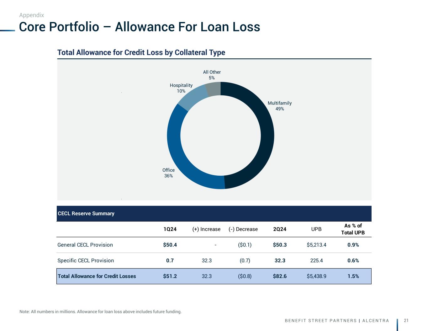B E N E F I T S T R E E T P A R T N E R S | A L C E N T R A 21 Multifamily 49% Office 36% Hospitality 10% All Other 5% Core Portfolio – Allowance For Loan Loss Note: All numbers in millions. Allowance for loan loss above includes future funding. Appendix Total Allowance for Credit Loss by Collateral Type CECL Reserve Summary 1Q24 (+) Increase (-) Decrease 2Q24 UPB As % of Total UPB General CECL Provision $50.4 - ($0.1) $50.3 $5,213.4 0.9% Specific CECL Provision 0.7 32.3 (0.7) 32.3 225.4 0.6% Total Allowance for Credit Losses $51.2 32.3 ($0.8) $82.6 $5,438.9 1.5%
