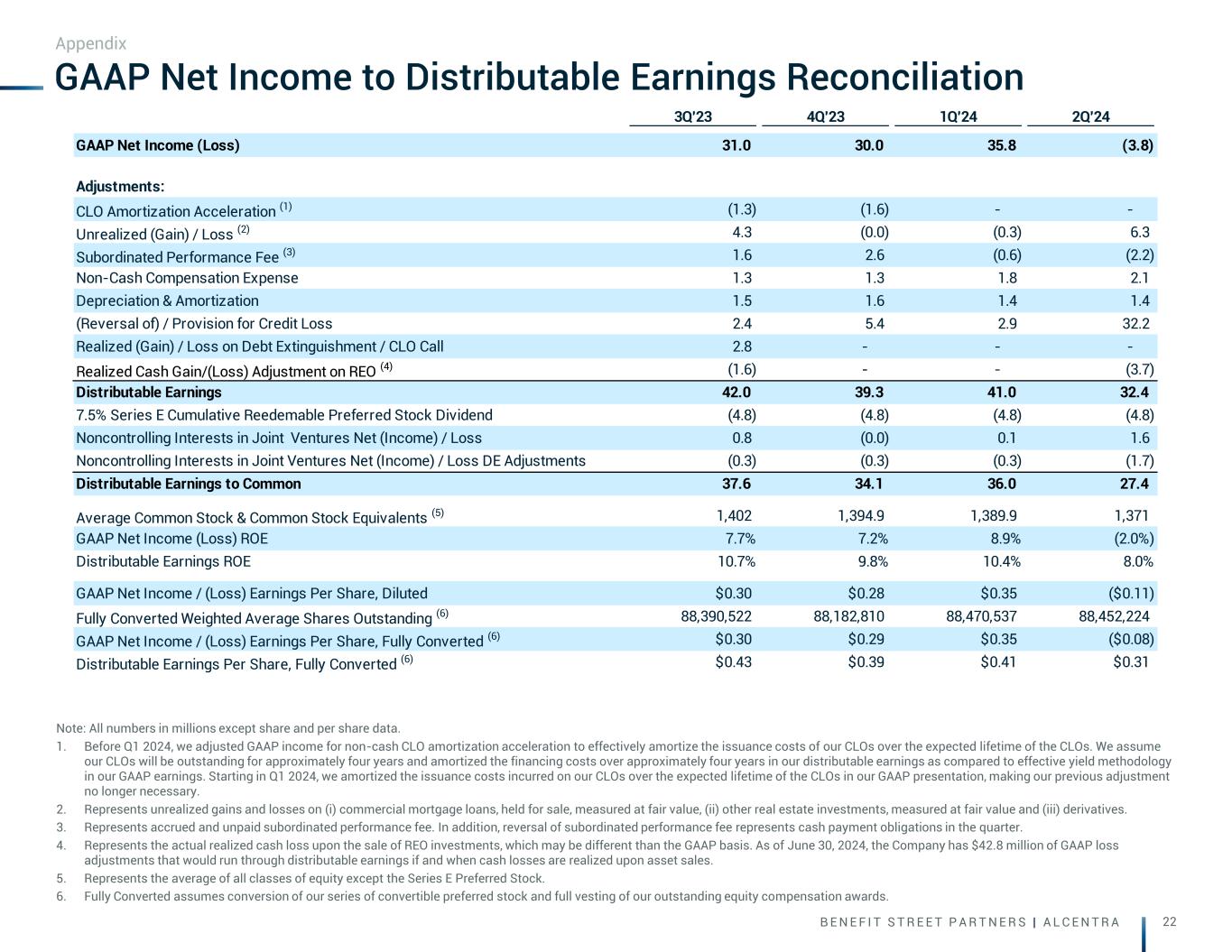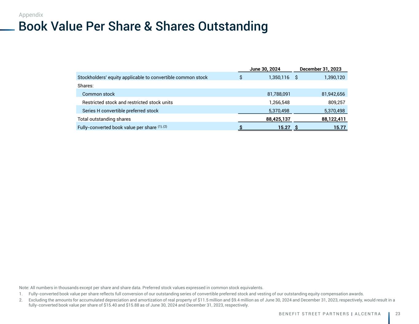 B E N E F I T S T R E E T P A R T N E R S | A L C E N T R A 22 3Q'23 4Q'23 1Q'24 2Q'24 GAAP Net Income (Loss) 31.0 30.0 35.8 (3.8) Adjustments: CLO Amortization Acceleration (1) (1.3) (1.6) - - Unrealized (Gain) / Loss (2) 4.3 (0.0) (0.3) 6.3 Subordinated Performance Fee (3) 1.6 2.6 (0.6) (2.2) Non-Cash Compensation Expense 1.3 1.3 1.8 2.1 Depreciation & Amortization 1.5 1.6 1.4 1.4 (Reversal of) / Provision for Credit Loss 2.4 5.4 2.9 32.2 Realized (Gain) / Loss on Debt Extinguishment / CLO Call 2.8 - - - Realized Cash Gain/(Loss) Adjustment on REO (4) (1.6) - - (3.7) Distributable Earnings 42.0 39.3 41.0 32.4 7.5% Series E Cumulative Reedemable Preferred Stock Dividend (4.8) (4.8) (4.8) (4.8) Noncontrolling Interests in Joint Ventures Net (Income) / Loss 0.8 (0.0) 0.1 1.6 Noncontrolling Interests in Joint Ventures Net (Income) / Loss DE Adjustments (0.3) (0.3) (0.3) (1.7) Distributable Earnings to Common 37.6 34.1 36.0 27.4 Average Common Stock & Common Stock Equivalents (5) 1,402 1,394.9 1,389.9 1,371 GAAP Net Income (Loss) ROE 7.7% 7.2% 8.9% (2.0%) Distributable Earnings ROE 10.7% 9.8% 10.4% 8.0% GAAP Net Income / (Loss) Earnings Per Share, Diluted $0.30 $0.28 $0.35 ($0.11) Fully Converted Weighted Average Shares Outstanding (6) 88,390,522 88,182,810 88,470,537 88,452,224 GAAP Net Income / (Loss) Earnings Per Share, Fully Converted (6) $0.30 $0.29 $0.35 ($0.08) Distributable Earnings Per Share, Fully Converted (6) $0.43 $0.39 $0.41 $0.31 GAAP Net Income to Distributable Earnings Reconciliation Note: All numbers in millions except share and per share data. 1. Before Q1 2024, we adjusted GAAP income for non-cash CLO amortization acceleration to effectively amortize the issuance costs of our CLOs over the expected lifetime of the CLOs. We assume our CLOs will be outstanding for approximately four years and amortized the financing costs over approximately four years in our distributable earnings as compared to effective yield methodology in our GAAP earnings. Starting in Q1 2024, we amortized the issuance costs incurred on our CLOs over the expected lifetime of the CLOs in our GAAP presentation, making our previous adjustment no longer necessary. 2. Represents unrealized gains and losses on (i) commercial mortgage loans, held for sale, measured at fair value, (ii) other real estate investments, measured at fair value and (iii) derivatives. 3. Represents accrued and unpaid subordinated performance fee. In addition, reversal of subordinated performance fee represents cash payment obligations in the quarter. 4. Represents the actual realized cash loss upon the sale of REO investments, which may be different than the GAAP basis. As of June 30, 2024, the Company has $42.8 million of GAAP loss adjustments that would run through distributable earnings if and when cash losses are realized upon asset sales. 5. Represents the average of all classes of equity except the Series E Preferred Stock. 6. Fully Converted assumes conversion of our series of convertible preferred stock and full vesting of our outstanding equity compensation awards. Appendix