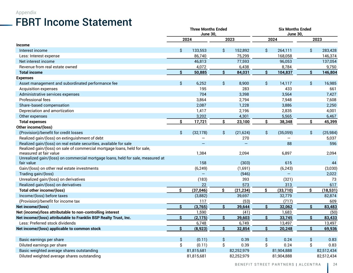 B E N E F I T S T R E E T P A R T N E R S | A L C E N T R A 24 FBRT Income Statement Appendix Three Months Ended June 30, Six Months Ended June 30, 2024 2023 2024 2023 Income Interest income $ 133,553 $ 152,892 $ 264,111 $ 283,428 Less: Interest expense 86,740 75,299 168,058 146,374 Net interest income 46,813 77,593 96,053 137,054 Revenue from real estate owned 4,072 6,438 8,784 9,750 Total income $ 50,885 $ 84,031 $ 104,837 $ 146,804 Expenses Asset management and subordinated performance fee $ 6,252 $ 8,900 $ 14,117 $ 16,985 Acquisition expenses 195 283 433 661 Administrative services expenses 704 3,398 3,564 7,427 Professional fees 3,864 2,794 7,948 7,608 Share-based compensation 2,087 1,228 3,886 2,250 Depreciation and amortization 1,417 2,196 2,835 4,001 Other expenses 3,202 4,301 5,565 6,467 Total expenses $ 17,721 $ 23,100 $ 38,348 $ 45,399 Other income/(loss) (Provision)/benefit for credit losses $ (32,178) $ (21,624) $ (35,059) $ (25,984) Realized gain/(loss) on extinguishment of debt — 270 — 5,037 Realized gain/(loss) on real estate securities, available for sale — — 88 596 Realized gain/(loss) on sale of commercial mortgage loans, held for sale, measured at fair value 1,384 2,094 6,897 2,094 Unrealized gain/(loss) on commercial mortgage loans, held for sale, measured at fair value 158 (303) 615 44 Gain/(loss) on other real estate investments (6,249) (1,691) (6,243) (3,030) Trading gain/(loss) — (946) — 2,022 Unrealized gain/(loss) on derivatives (183) 393 (321) 73 Realized gain/(loss) on derivatives 22 573 313 617 Total other income/(loss) $ (37,046) $ (21,234) $ (33,710) $ (18,531) Income/(loss) before taxes (3,882) 39,697 32,779 82,874 (Provision)/benefit for income tax 117 (53) (717) 609 Net income/(loss) $ (3,765) $ 39,644 $ 32,062 $ 83,483 Net (income)/loss attributable to non-controlling interest 1,590 (41) 1,683 (50) Net income/(loss) attributable to Franklin BSP Realty Trust, Inc. $ (2,175) $ 39,603 $ 33,745 $ 83,433 Less: Preferred stock dividends 6,748 6,749 13,497 13,497 Net income/(loss) applicable to common stock $ (8,923) $ 32,854 $ 20,248 $ 69,936 Basic earnings per share $ (0.11) $ 0.39 $ 0.24 $ 0.83 Diluted earnings per share $ (0.11) $ 0.39 $ 0.24 $ 0.83 Basic weighted average shares outstanding 81,815,681 82,252,979 81,904,888 82,512,434 Diluted weighted average shares outstanding 81,815,681 82,252,979 81,904,888 82,512,434