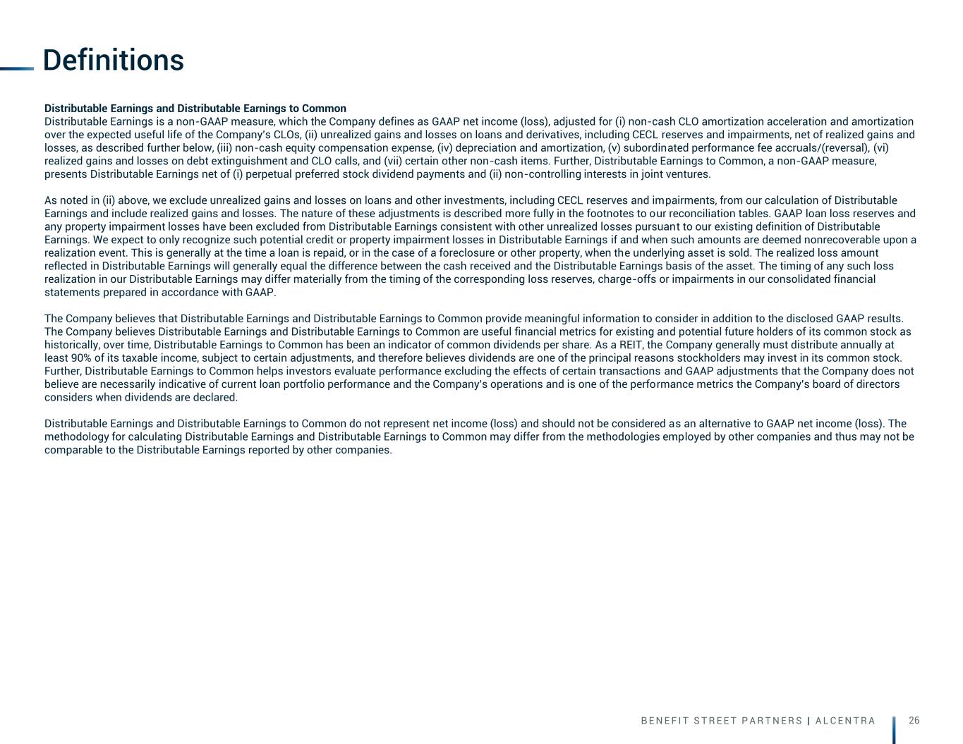B E N E F I T S T R E E T P A R T N E R S | A L C E N T R A 26 Definitions Distributable Earnings and Distributable Earnings to Common Distributable Earnings is a non-GAAP measure, which the Company defines as GAAP net income (loss), adjusted for (i) non-cash CLO amortization acceleration and amortization over the expected useful life of the Company's CLOs, (ii) unrealized gains and losses on loans and derivatives, including CECL reserves and impairments, net of realized gains and losses, as described further below, (iii) non-cash equity compensation expense, (iv) depreciation and amortization, (v) subordinated performance fee accruals/(reversal), (vi) realized gains and losses on debt extinguishment and CLO calls, and (vii) certain other non-cash items. Further, Distributable Earnings to Common, a non-GAAP measure, presents Distributable Earnings net of (i) perpetual preferred stock dividend payments and (ii) non-controlling interests in joint ventures. As noted in (ii) above, we exclude unrealized gains and losses on loans and other investments, including CECL reserves and impairments, from our calculation of Distributable Earnings and include realized gains and losses. The nature of these adjustments is described more fully in the footnotes to our reconciliation tables. GAAP loan loss reserves and any property impairment losses have been excluded from Distributable Earnings consistent with other unrealized losses pursuant to our existing definition of Distributable Earnings. We expect to only recognize such potential credit or property impairment losses in Distributable Earnings if and when such amounts are deemed nonrecoverable upon a realization event. This is generally at the time a loan is repaid, or in the case of a foreclosure or other property, when the underlying asset is sold. The realized loss amount reflected in Distributable Earnings will generally equal the difference between the cash received and the Distributable Earnings basis of the asset. The timing of any such loss realization in our Distributable Earnings may differ materially from the timing of the corresponding loss reserves, charge-offs or impairments in our consolidated financial statements prepared in accordance with GAAP. The Company believes that Distributable Earnings and Distributable Earnings to Common provide meaningful information to consider in addition to the disclosed GAAP results. The Company believes Distributable Earnings and Distributable Earnings to Common are useful financial metrics for existing and potential future holders of its common stock as historically, over time, Distributable Earnings to Common has been an indicator of common dividends per share. As a REIT, the Company generally must distribute annually at least 90% of its taxable income, subject to certain adjustments, and therefore believes dividends are one of the principal reasons stockholders may invest in its common stock. Further, Distributable Earnings to Common helps investors evaluate performance excluding the effects of certain transactions and GAAP adjustments that the Company does not believe are necessarily indicative of current loan portfolio performance and the Company's operations and is one of the performance metrics the Company's board of directors considers when dividends are declared. Distributable Earnings and Distributable Earnings to Common do not represent net income (loss) and should not be considered as an alternative to GAAP net income (loss). The methodology for calculating Distributable Earnings and Distributable Earnings to Common may differ from the methodologies employed by other companies and thus may not be comparable to the Distributable Earnings reported by other companies.
