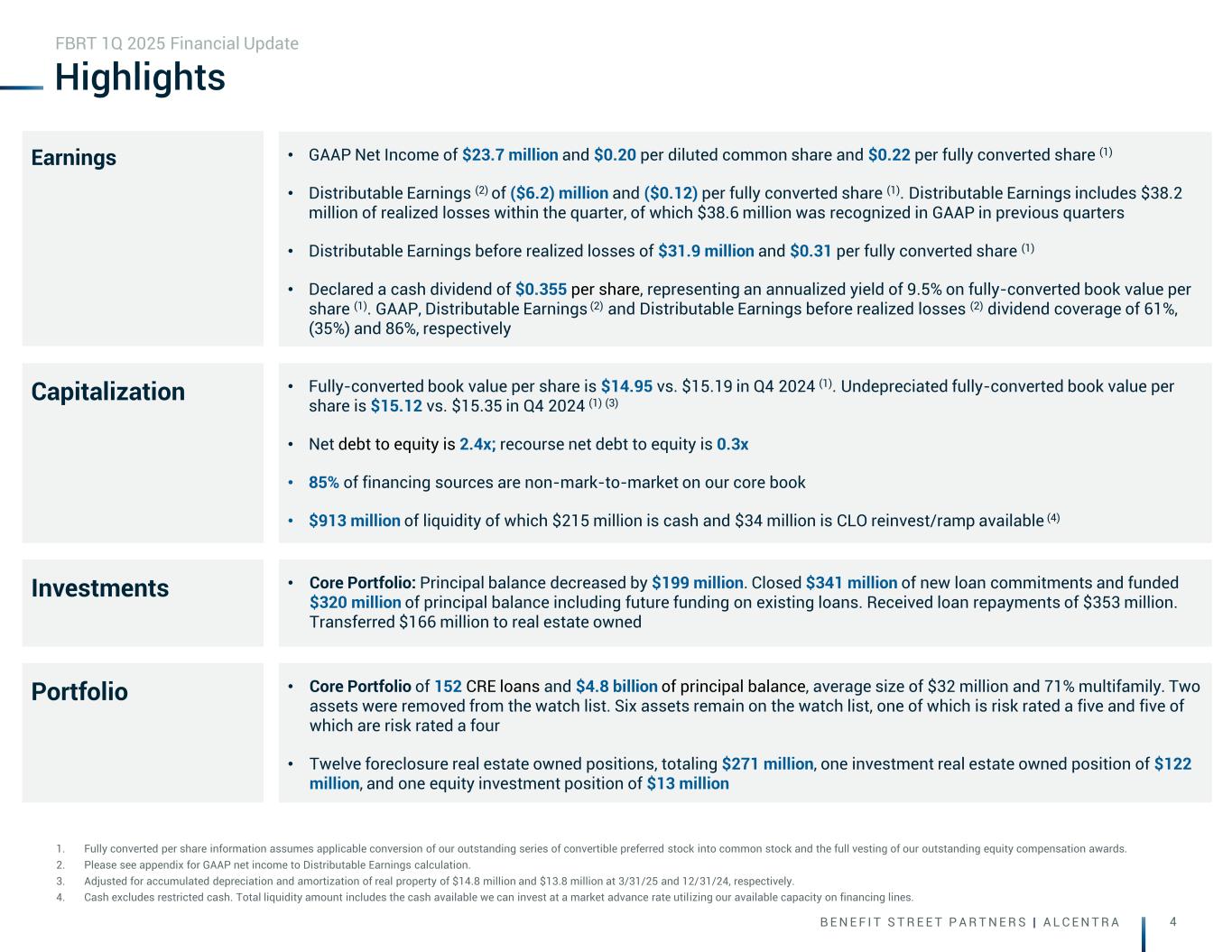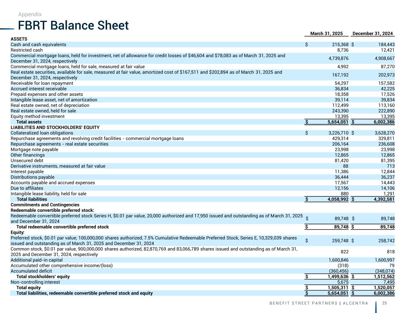 B E N E F I T S T R E E T P A R T N E R S | A L C E N T R A 25 FBRT Balance Sheet Appendix March 31, 2025 December 31, 2024 ASSETS Cash and cash equivalents $ 215,368 $ 184,443 Restricted cash 8,736 12,421 Commercial mortgage loans, held for investment, net of allowance for credit losses of $46,604 and $78,083 as of March 31, 2025 and December 31, 2024, respectively 4,739,876 4,908,667 Commercial mortgage loans, held for sale, measured at fair value 4,992 87,270 Real estate securities, available for sale, measured at fair value, amortized cost of $167,511 and $202,894 as of March 31, 2025 and December 31, 2024, respectively 167,192 202,973 Receivable for loan repayment 54,297 157,582 Accrued interest receivable 36,834 42,225 Prepaid expenses and other assets 18,358 17,526 Intangible lease asset, net of amortization 39,114 39,834 Real estate owned, net of depreciation 112,499 113,160 Real estate owned, held for sale 243,390 222,890 Equity method investment 13,395 13,395 Total assets $ 5,654,051 $ 6,002,386 LIABILITIES AND STOCKHOLDERS' EQUITY Collateralized loan obligations $ 3,226,710 $ 3,628,270 Repurchase agreements and revolving credit facilities - commercial mortgage loans 429,314 329,811 Repurchase agreements - real estate securities 206,164 236,608 Mortgage note payable 23,998 23,998 Other financings 12,865 12,865 Unsecured debt 81,420 81,395 Derivative instruments, measured at fair value 88 713 Interest payable 11,386 12,844 Distributions payable 36,444 36,237 Accounts payable and accrued expenses 17,567 14,443 Due to affiliates 12,156 14,106 Intangible lease liability, held for sale 880 1,291 Total liabilities $ 4,058,992 $ 4,392,581 Commitments and Contingencies Redeemable convertible preferred stock: Redeemable convertible preferred stock Series H, $0.01 par value, 20,000 authorized and 17,950 issued and outstanding as of March 31, 2025 and December 31, 2024 $ 89,748 $ 89,748 Total redeemable convertible preferred stock $ 89,748 $ 89,748 Equity: Preferred stock, $0.01 par value; 100,000,000 shares authorized, 7.5% Cumulative Redeemable Preferred Stock, Series E, 10,329,039 shares issued and outstanding as of March 31, 2025 and December 31, 2024 $ 259,748 $ 258,742 Common stock, $0.01 par value, 900,000,000 shares authorized, 82,870,769 and 83,066,789 shares issued and outstanding as of March 31, 2025 and December 31, 2024, respectively 822 818 Additional paid-in capital 1,600,846 1,600,997 Accumulated other comprehensive income/(loss) (318) 79 Accumulated deficit (360,456) (348,074) Total stockholders' equity $ 1,499,636 $ 1,512,562 Non-controlling interest 5,675 7,495 Total equity $ 1,505,311 $ 1,520,057 Total liabilities, redeemable convertible preferred stock and equity $ 5,654,051 $ 6,002,386