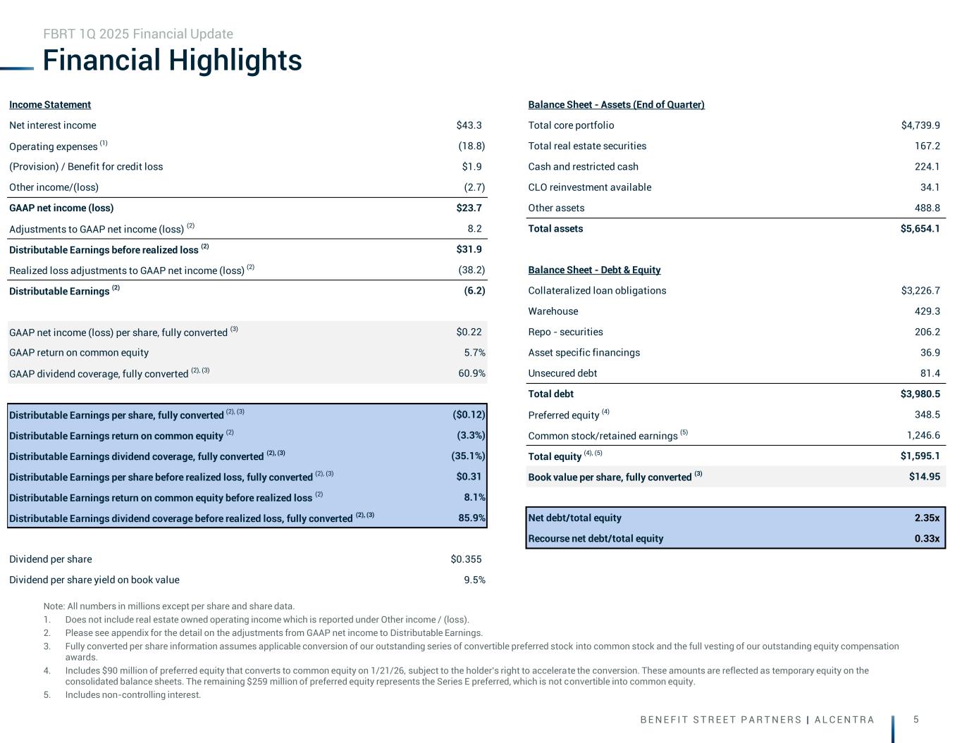 B E N E F I T S T R E E T P A R T N E R S | A L C E N T R A 4 Highlights 1. Fully converted per share information assumes applicable conversion of our outstanding series of convertible preferred stock into common stock and the full vesting of our outstanding equity compensation awards. 2. Please see appendix for GAAP net income to Distributable Earnings calculation. 3. Adjusted for accumulated depreciation and amortization of real property of $14.8 million and $13.8 million at 3/31/25 and 12/31/24, respectively. 4. Cash excludes restricted cash. Total liquidity amount includes the cash available we can invest at a market advance rate utilizing our available capacity on financing lines. FBRT 1Q 2025 Financial Update • Fully-converted book value per share is $14.95 vs. $15.19 in Q4 2024 (1). Undepreciated fully-converted book value per share is $15.12 vs. $15.35 in Q4 2024 (1) (3) • Net debt to equity is 2.4x; recourse net debt to equity is 0.3x • 85% of financing sources are non-mark-to-market on our core book • $913 million of liquidity of which $215 million is cash and $34 million is CLO reinvest/ramp available (4) • Core Portfolio: Principal balance decreased by $199 million. Closed $341 million of new loan commitments and funded $320 million of principal balance including future funding on existing loans. Received loan repayments of $353 million. Transferred $166 million to real estate owned • Core Portfolio of 152 CRE loans and $4.8 billion of principal balance, average size of $32 million and 71% multifamily. Two assets were removed from the watch list. Six assets remain on the watch list, one of which is risk rated a five and five of which are risk rated a four • Twelve foreclosure real estate owned positions, totaling $271 million, one investment real estate owned position of $122 million, and one equity investment position of $13 million Capitalization Investments Portfolio Earnings • GAAP Net Income of $23.7 million and $0.20 per diluted common share and $0.22 per fully converted share (1) • Distributable Earnings (2) of ($6.2) million and ($0.12) per fully converted share (1). Distributable Earnings includes $38.2 million of realized losses within the quarter, of which $38.6 million was recognized in GAAP in previous quarters • Distributable Earnings before realized losses of $31.9 million and $0.31 per fully converted share (1) • Declared a cash dividend of $0.355 per share, representing an annualized yield of 9.5% on fully-converted book value per share (1). GAAP, Distributable Earnings (2) and Distributable Earnings before realized losses (2) dividend coverage of 61%, (35%) and 86%, respectively