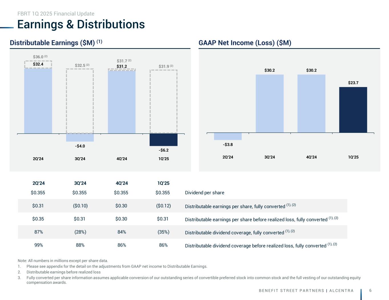 B E N E F I T S T R E E T P A R T N E R S | A L C E N T R A 5 Income Statement Balance Sheet - Assets (End of Quarter) Net interest income $43.3 Total core portfolio $4,739.9 Operating expenses (1) (18.8) Total real estate securities 167.2 (Provision) / Benefit for credit loss $1.9 Cash and restricted cash 224.1 Other income/(loss) (2.7) CLO reinvestment available 34.1 GAAP net income (loss) $23.7 Other assets 488.8 Adjustments to GAAP net income (loss) (2) 8.2 Total assets $5,654.1 Distributable Earnings before realized loss (2) $31.9 Realized loss adjustments to GAAP net income (loss) (2) (38.2) Balance Sheet - Debt & Equity Distributable Earnings (2) (6.2) Collateralized loan obligations $3,226.7 Warehouse 429.3 GAAP net income (loss) per share, fully converted (3) $0.22 Repo - securities 206.2 GAAP return on common equity 5.7% Asset specific financings 36.9 GAAP dividend coverage, fully converted (2), (3) 60.9% Unsecured debt 81.4 Total debt $3,980.5 Distributable Earnings per share, fully converted (2), (3) ($0.12) Preferred equity (4) 348.5 Distributable Earnings return on common equity (2) (3.3%) Common stock/retained earnings (5) 1,246.6 Distributable Earnings dividend coverage, fully converted (2), (3) (35.1%) Total equity (4), (5) $1,595.1 Distributable Earnings per share before realized loss, fully converted (2), (3) $0.31 Book value per share, fully converted (3) $14.95 Distributable Earnings return on common equity before realized loss (2) 8.1% Distributable Earnings dividend coverage before realized loss, fully converted (2), (3) 85.9% Net debt/total equity 2.35x Recourse net debt/total equity 0.33x Dividend per share $0.355 Dividend per share yield on book value 9.5% Financial Highlights Note: All numbers in millions except per share and share data. 1. Does not include real estate owned operating income which is reported under Other income / (loss). 2. Please see appendix for the detail on the adjustments from GAAP net income to Distributable Earnings. 3. Fully converted per share information assumes applicable conversion of our outstanding series of convertible preferred stock into common stock and the full vesting of our outstanding equity compensation awards. 4. Includes $90 million of preferred equity that converts to common equity on 1/21/26, subject to the holder's right to accelerate the conversion. These amounts are reflected as temporary equity on the consolidated balance sheets. The remaining $259 million of preferred equity represents the Series E preferred, which is not convertible into common equity. 5. Includes non-controlling interest. FBRT 1Q 2025 Financial Update