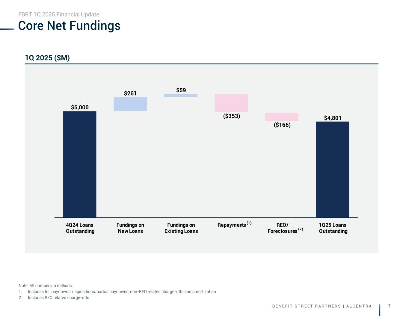 B E N E F I T S T R E E T P A R T N E R S | A L C E N T R A 6 $32.4 -$4.0 $31.2 -$6.2 2Q'24 3Q'24 4Q'24 1Q'25 $31.9 (2)$32.5 (2) $36.0 (2) $31.7 (2) -$3.8 $30.2 $30.2 $23.7 2Q'24 3Q'24 4Q'24 1Q'25 2Q'24 3Q'24 4Q'24 1Q'25 $0.355 $0.355 $0.355 $0.355 Dividend per share $0.31 ($0.10) $0.30 ($0.12) Distributable earnings per share, fully converted (1), (2) $0.35 $0.31 $0.30 $0.31 Distributable earnings per share before realized loss, fully converted (1), (2) 87% (28%) 84% (35%) Distributable dividend coverage, fully converted (1), (2) 99% 88% 86% 86% Distributable dividend coverage before realized loss, fully converted (1), (2) Earnings & Distributions Note: All numbers in millions except per share data. 1. Please see appendix for the detail on the adjustments from GAAP net income to Distributable Earnings. 2. Distributable earnings before realized loss 3. Fully converted per share information assumes applicable conversion of our outstanding series of convertible preferred stock into common stock and the full vesting of our outstanding equity compensation awards. FBRT 1Q 2025 Financial Update Distributable Earnings ($M) (1) GAAP Net Income (Loss) ($M)