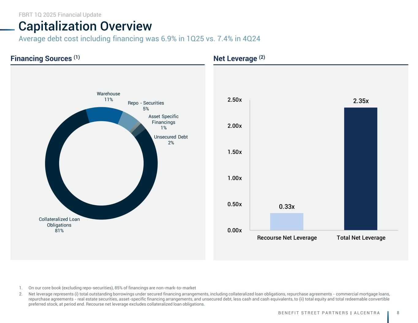 B E N E F I T S T R E E T P A R T N E R S | A L C E N T R A 7 Note: All numbers in millions. 1. Includes full paydowns, dispositions, partial paydowns, non-REO related charge-offs and amortization 2. Includes REO related charge-offs Core Net Fundings FBRT 1Q 2025 Financial Update 1Q 2025 ($M) $5,000 $261 $59 ($353) ($166) $4,801 4Q24 Loans Outstanding Fundings on New Loans Fundings on Existing Loans Repayments REO/ Foreclosures 1Q25 Loans Outstanding (1 ) (2 )