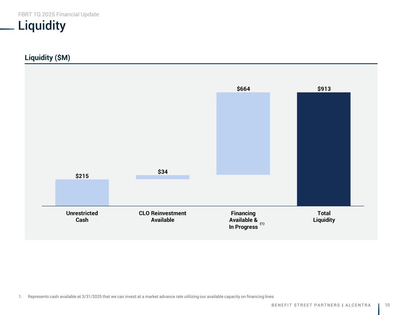 B E N E F I T S T R E E T P A R T N E R S | A L C E N T R A 9 Financing Detail 1. Outstanding balance as of March 31, 2025 and net of tranches held by FBRT 2. Cost of debt is shown before discount and transaction costs 3. Commitment for loans. Excludes bond repurchase agreements FBRT 1Q 2025 Financial Update CLOs Warehouse/Revolver/Other CLO Name Debt Amount(1) Reinvest End Date Cost of Debt(2) BSPRT 2021-FL6 $253 million Ended S + 1.83% BSPRT 2021-FL7 $378 million Ended S + 1.92% BSPRT 2022-FL8 $577 million Ended S + 1.87% BSPRT 2022-FL9 $442 million Ended S + 3.06% BSPRT 2023-FL10 $717 million 4/8/25 S + 2.59% BSPRT 2024-FL11 $886 million 10/8/27 S + 1.99% Total $3,253 million CLO reinvestment available $34 million Repo – Securities (outstanding) $206 million Name Commitment (3) Barclays (Warehouse) $500 million Wells Fargo $400 million JP Morgan $500 million Atlas SP Partners $350 million Churchill $225 million Barclays (Secured Revolver) $100 million Total $2,075 million