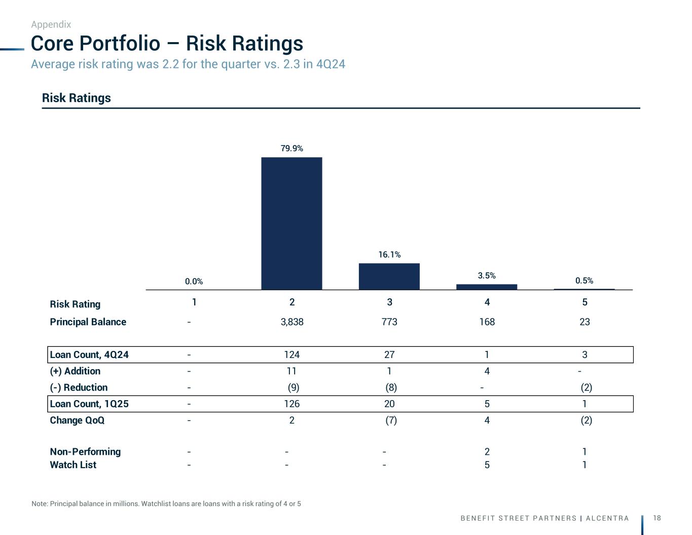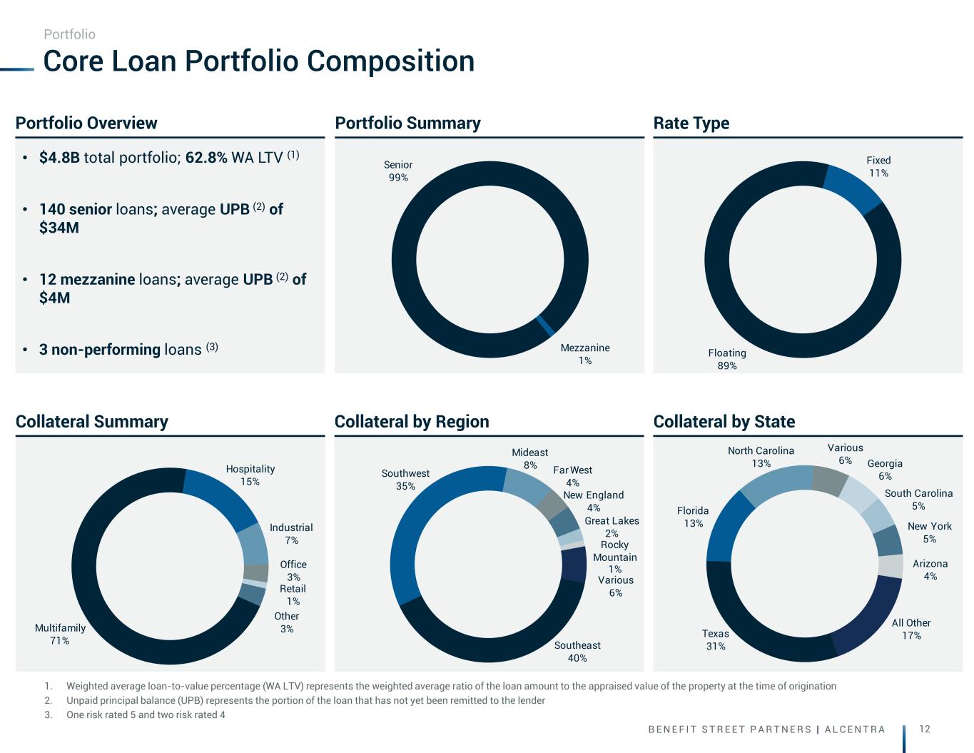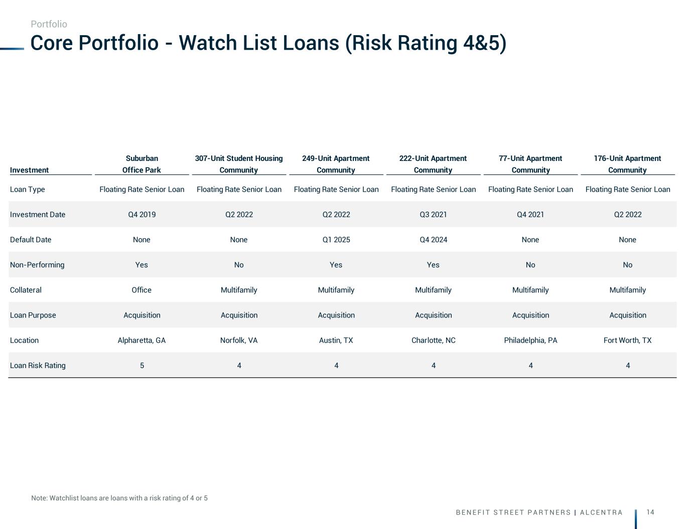 B E N E F I T S T R E E T P A R T N E R S | A L C E N T R A 14 Core Portfolio - Watch List Loans (Risk Rating 4&5) Note: Watchlist loans are loans with a risk rating of 4 or 5 Portfolio Investment Suburban Office Park 307-Unit Student Housing Community 249-Unit Apartment Community 222-Unit Apartment Community 77-Unit Apartment Community 176-Unit Apartment Community Loan Type Floating Rate Senior Loan Floating Rate Senior Loan Floating Rate Senior Loan Floating Rate Senior Loan Floating Rate Senior Loan Floating Rate Senior Loan Investment Date Q4 2019 Q2 2022 Q2 2022 Q3 2021 Q4 2021 Q2 2022 Default Date None None Q1 2025 Q4 2024 None None Non-Performing Yes No Yes Yes No No Collateral Office Multifamily Multifamily Multifamily Multifamily Multifamily Loan Purpose Acquisition Acquisition Acquisition Acquisition Acquisition Acquisition Location Alpharetta, GA Norfolk, VA Austin, TX Charlotte, NC Philadelphia, PA Fort Worth, TX Loan Risk Rating 5 4 4 4 4 4