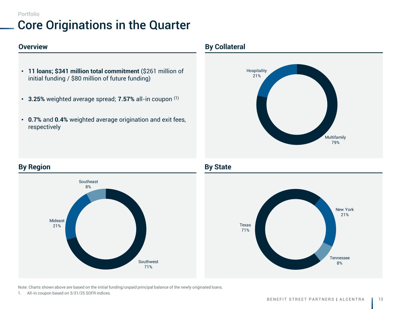B E N E F I T S T R E E T P A R T N E R S | A L C E N T R A 12 Collateral by Region Texas 31% Florida 13% North Carolina 13% Various 6% Georgia 6% South Carolina 5% New York 5% Arizona 4% All Other 17% Core Loan Portfolio Composition 1. Weighted average loan-to-value percentage (WA LTV) represents the weighted average ratio of the loan amount to the appraised value of the property at the time of origination 2. Unpaid principal balance (UPB) represents the portion of the loan that has not yet been remitted to the lender 3. One risk rated 5 and two risk rated 4 Portfolio Rate TypePortfolio Summary Collateral by StateCollateral Summary • $4.8B total portfolio; 62.8% WA LTV (1) • 140 senior loans; average UPB (2) of $34M • 12 mezzanine loans; average UPB (2) of $4M • 3 non-performing loans (3) Portfolio Overview Southeast 40% Southwest 35% Mideast 8% Far West 4% New England 4% Great Lakes 2% Rocky Mountain 1% Various 6% Floating 89% Fixed 11% Senior 99% Mezzanine 1% Multifamily 71% Hospitality 15% Industrial 7% Office 3% Retail 1% Other 3%