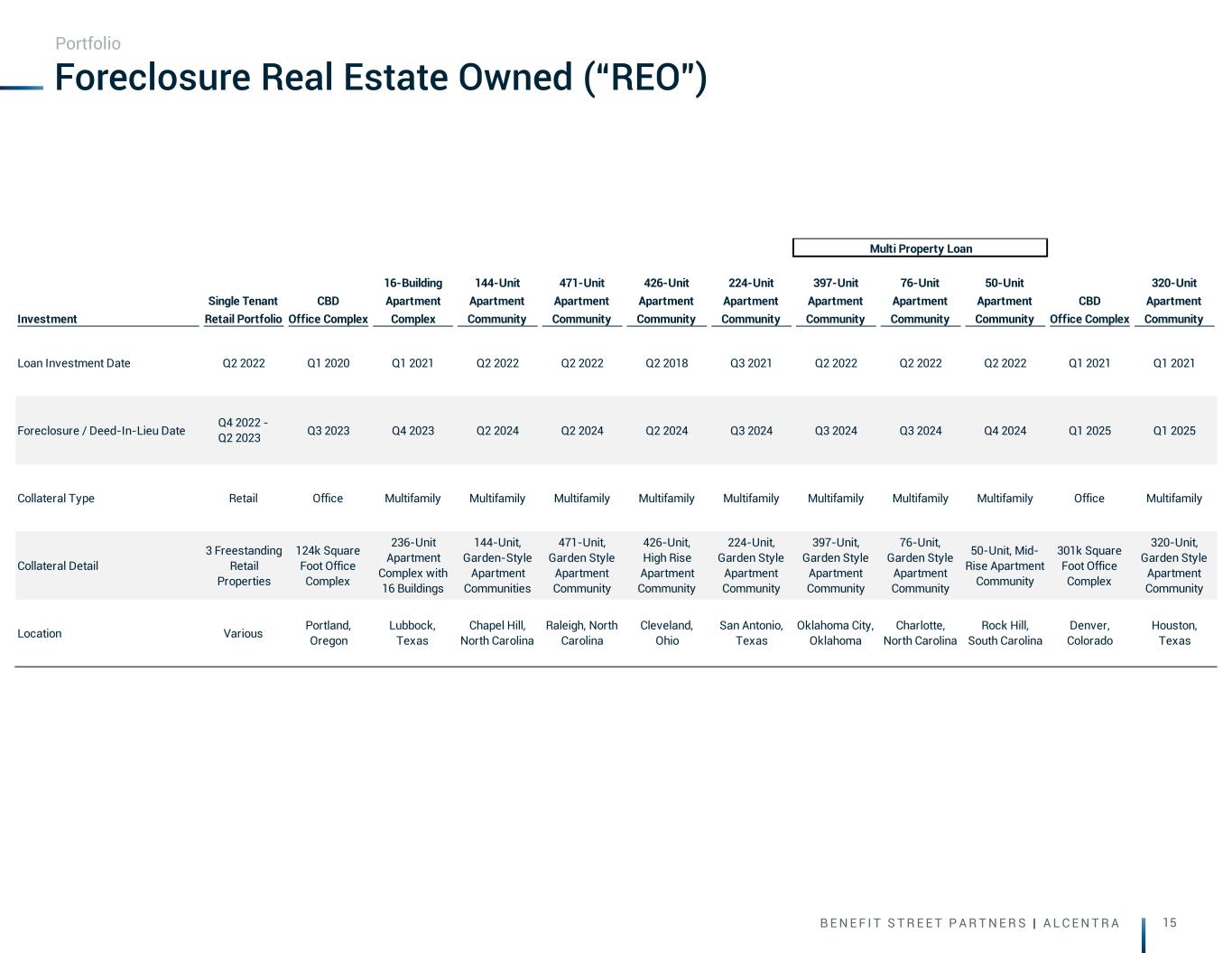B E N E F I T S T R E E T P A R T N E R S | A L C E N T R A 15 Investment Single Tenant Retail Portfolio CBD Office Complex 16-Building Apartment Complex 144-Unit Apartment Community 471-Unit Apartment Community 426-Unit Apartment Community 224-Unit Apartment Community 397-Unit Apartment Community 76-Unit Apartment Community 50-Unit Apartment Community CBD Office Complex 320-Unit Apartment Community Loan Investment Date Q2 2022 Q1 2020 Q1 2021 Q2 2022 Q2 2022 Q2 2018 Q3 2021 Q2 2022 Q2 2022 Q2 2022 Q1 2021 Q1 2021 Foreclosure / Deed-In-Lieu Date Q4 2022 - Q2 2023 - Q3 2023 Q4 2023 Q2 2024 Q2 2024 Q2 2024 Q3 2024 Q3 2024 Q3 2024 Q4 2024 Q1 2025 Q1 2025 Collateral Type Retail Office Multifamily Multifamily Multifamily Multifamily Multifamily Multifamily Multifamily Multifamily Office Multifamily Collateral Detail 3 Freestanding Retail Properties 124k Square Foot Office Complex 236-Unit Apartment Complex with 16 Buildings 144-Unit, Garden-Style Apartment Communities 471-Unit, Garden Style Apartment Community 426-Unit, High Rise Apartment Community 224-Unit, Garden Style Apartment Community 397-Unit, Garden Style Apartment Community 76-Unit, Garden Style Apartment Community 50-Unit, Mid- Rise Apartment Community 301k Square Foot Office Complex 320-Unit, Garden Style Apartment Community Location Various Portland, Oregon Lubbock, Texas Chapel Hill, North Carolina Raleigh, North Carolina Cleveland, Ohio San Antonio, Texas Oklahoma City, Oklahoma Charlotte, North Carolina Rock Hill, South Carolina Denver, Colorado Houston, Texas Multi Property Loan Foreclosure Real Estate Owned (“REO”) Portfolio