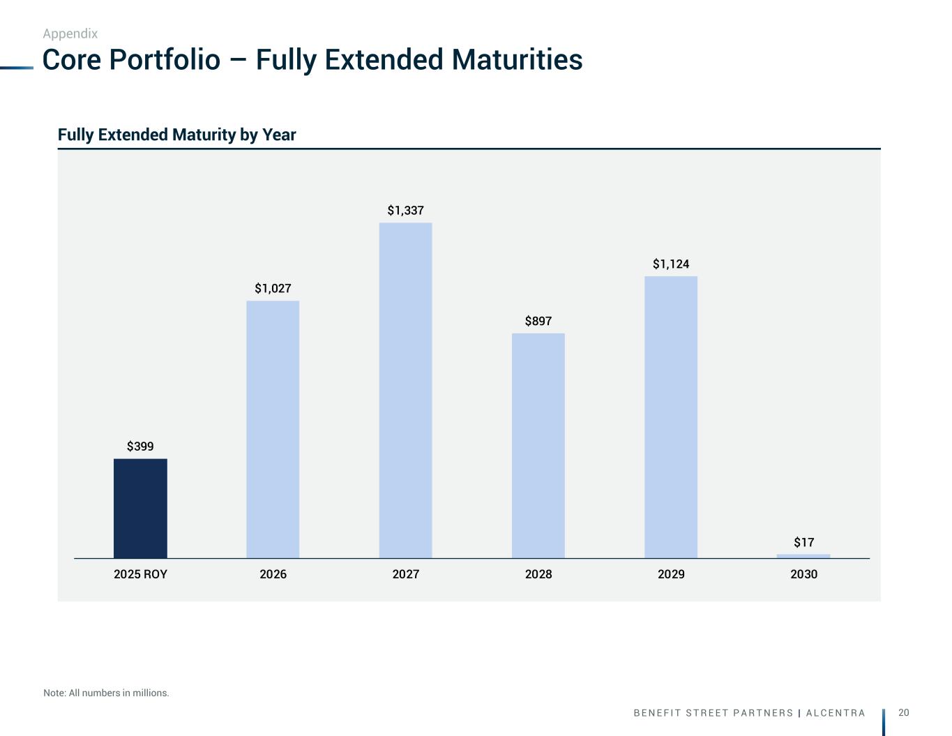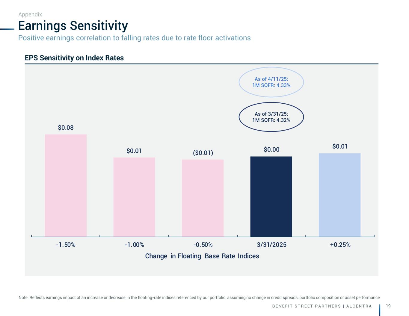 B E N E F I T S T R E E T P A R T N E R S | A L C E N T R A 19 $0.08 $0.01 ($0.01) $0.00 $0.01 -1.50% -1.00% -0.50% 3/31/2025 +0.25% Change in Floating Base Rate Indices Earnings Sensitivity Note: Reflects earnings impact of an increase or decrease in the floating-rate indices referenced by our portfolio, assuming no change in credit spreads, portfolio composition or asset performance Appendix EPS Sensitivity on Index Rates Positive earnings correlation to falling rates due to rate floor activations As of 4/11/25: 1M SOFR: 4.33% As of 3/31/25: 1M SOFR: 4.32%