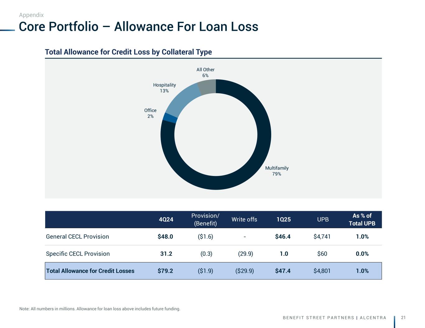 B E N E F I T S T R E E T P A R T N E R S | A L C E N T R A 21 4Q24 Provision/ (Benefit) Write offs 1Q25 UPB As % of Total UPB General CECL Provision $48.0 ($1.6) - $46.4 $4,741 1.0% Specific CECL Provision 31.2 (0.3) (29.9) 1.0 $60 0.0% Total Allowance for Credit Losses $79.2 ($1.9) ($29.9) $47.4 $4,801 1.0% Multifamily 79% Office 2% Hospitality 13% All Other 6% Core Portfolio – Allowance For Loan Loss Note: All numbers in millions. Allowance for loan loss above includes future funding. Appendix Total Allowance for Credit Loss by Collateral Type