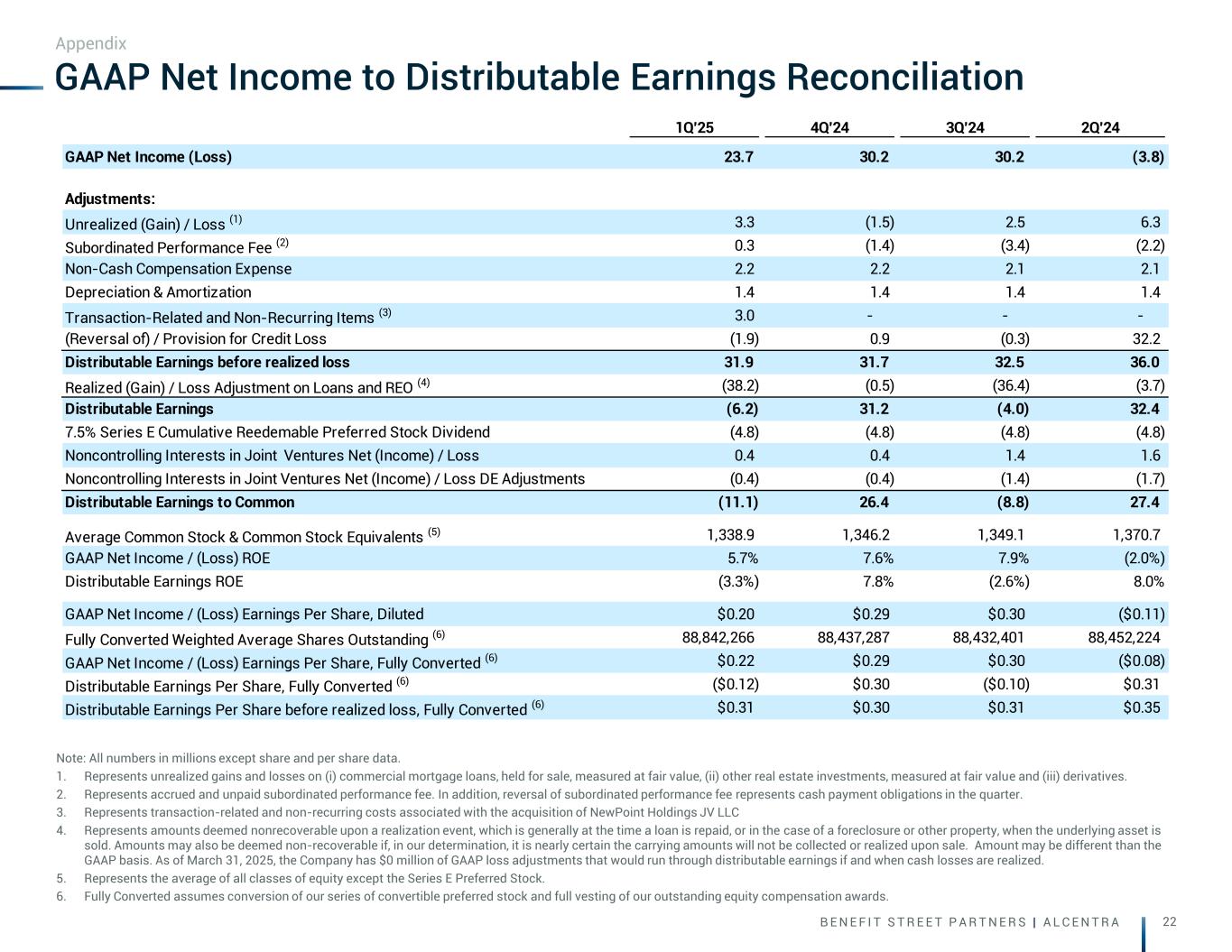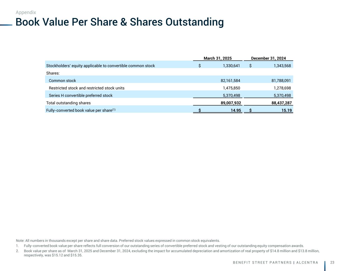 B E N E F I T S T R E E T P A R T N E R S | A L C E N T R A 22 1Q'25 4Q'24 3Q'24 2Q'24 GAAP Net Income (Loss) 23.7 30.2 30.2 (3.8) Adjustments: Unrealized (Gain) / Loss (1) 3.3 (1.5) 2.5 6.3 Subordinated Performance Fee (2) 0.3 (1.4) (3.4) (2.2) Non-Cash Compensation Expense 2.2 2.2 2.1 2.1 Depreciation & Amortization 1.4 1.4 1.4 1.4 Transaction-Related and Non-Recurring Items (3) 3.0 - - - (Reversal of) / Provision for Credit Loss (1.9) 0.9 (0.3) 32.2 Distributable Earnings before realized loss 31.9 31.7 32.5 36.0 Realized (Gain) / Loss Adjustment on Loans and REO (4) (38.2) (0.5) (36.4) (3.7) Distributable Earnings (6.2) 31.2 (4.0) 32.4 7.5% Series E Cumulative Reedemable Preferred Stock Dividend (4.8) (4.8) (4.8) (4.8) Noncontrolling Interests in Joint Ventures Net (Income) / Loss 0.4 0.4 1.4 1.6 Noncontrolling Interests in Joint Ventures Net (Income) / Loss DE Adjustments (0.4) (0.4) (1.4) (1.7) Distributable Earnings to Common (11.1) 26.4 (8.8) 27.4 Average Common Stock & Common Stock Equivalents (5) 1,338.9 1,346.2 1,349.1 1,370.7 GAAP Net Income / (Loss) ROE 5.7% 7.6% 7.9% (2.0%) Distributable Earnings ROE (3.3%) 7.8% (2.6%) 8.0% GAAP Net Income / (Loss) Earnings Per Share, Diluted $0.20 $0.29 $0.30 ($0.11) Fully Converted Weighted Average Shares Outstanding (6) 88,842,266 88,437,287 88,432,401 88,452,224 GAAP Net Income / (Loss) Earnings Per Share, Fully Converted (6) $0.22 $0.29 $0.30 ($0.08) Distributable Earnings Per Share, Fully Converted (6) ($0.12) $0.30 ($0.10) $0.31 Distributable Earnings Per Share before realized loss, Fully Converted (6) $0.31 $0.30 $0.31 $0.35 GAAP Net Income to Distributable Earnings Reconciliation Note: All numbers in millions except share and per share data. 1. Represents unrealized gains and losses on (i) commercial mortgage loans, held for sale, measured at fair value, (ii) other real estate investments, measured at fair value and (iii) derivatives. 2. Represents accrued and unpaid subordinated performance fee. In addition, reversal of subordinated performance fee represents cash payment obligations in the quarter. 3. Represents transaction-related and non-recurring costs associated with the acquisition of NewPoint Holdings JV LLC 4. Represents amounts deemed nonrecoverable upon a realization event, which is generally at the time a loan is repaid, or in the case of a foreclosure or other property, when the underlying asset is sold. Amounts may also be deemed non-recoverable if, in our determination, it is nearly certain the carrying amounts will not be collected or realized upon sale. Amount may be different than the GAAP basis. As of March 31, 2025, the Company has $0 million of GAAP loss adjustments that would run through distributable earnings if and when cash losses are realized. 5. Represents the average of all classes of equity except the Series E Preferred Stock. 6. Fully Converted assumes conversion of our series of convertible preferred stock and full vesting of our outstanding equity compensation awards. Appendix