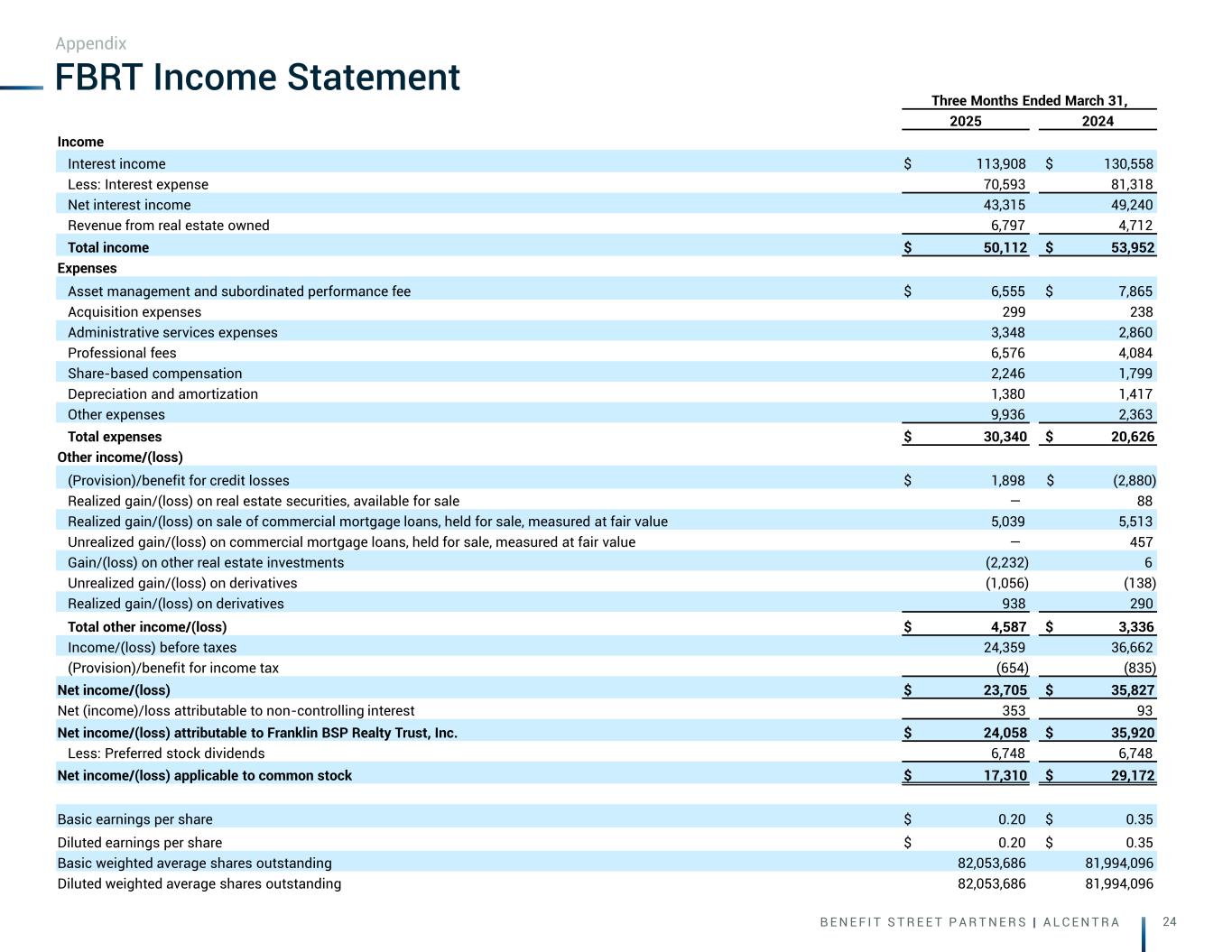B E N E F I T S T R E E T P A R T N E R S | A L C E N T R A 24 Three Months Ended March 31, 2025 2024 Income Interest income $ 113,908 $ 130,558 Less: Interest expense 70,593 81,318 Net interest income 43,315 49,240 Revenue from real estate owned 6,797 4,712 Total income $ 50,112 $ 53,952 Expenses Asset management and subordinated performance fee $ 6,555 $ 7,865 Acquisition expenses 299 238 Administrative services expenses 3,348 2,860 Professional fees 6,576 4,084 Share-based compensation 2,246 1,799 Depreciation and amortization 1,380 1,417 Other expenses 9,936 2,363 Total expenses $ 30,340 $ 20,626 Other income/(loss) (Provision)/benefit for credit losses $ 1,898 $ (2,880) Realized gain/(loss) on real estate securities, available for sale — 88 Realized gain/(loss) on sale of commercial mortgage loans, held for sale, measured at fair value 5,039 5,513 Unrealized gain/(loss) on commercial mortgage loans, held for sale, measured at fair value — 457 Gain/(loss) on other real estate investments (2,232) 6 Unrealized gain/(loss) on derivatives (1,056) (138) Realized gain/(loss) on derivatives 938 290 Total other income/(loss) $ 4,587 $ 3,336 Income/(loss) before taxes 24,359 36,662 (Provision)/benefit for income tax (654) (835) Net income/(loss) $ 23,705 $ 35,827 Net (income)/loss attributable to non-controlling interest 353 93 Net income/(loss) attributable to Franklin BSP Realty Trust, Inc. $ 24,058 $ 35,920 Less: Preferred stock dividends 6,748 6,748 Net income/(loss) applicable to common stock $ 17,310 $ 29,172 Basic earnings per share $ 0.20 $ 0.35 Diluted earnings per share $ 0.20 $ 0.35 Basic weighted average shares outstanding 82,053,686 81,994,096 Diluted weighted average shares outstanding 82,053,686 81,994,096 FBRT Income Statement Appendix