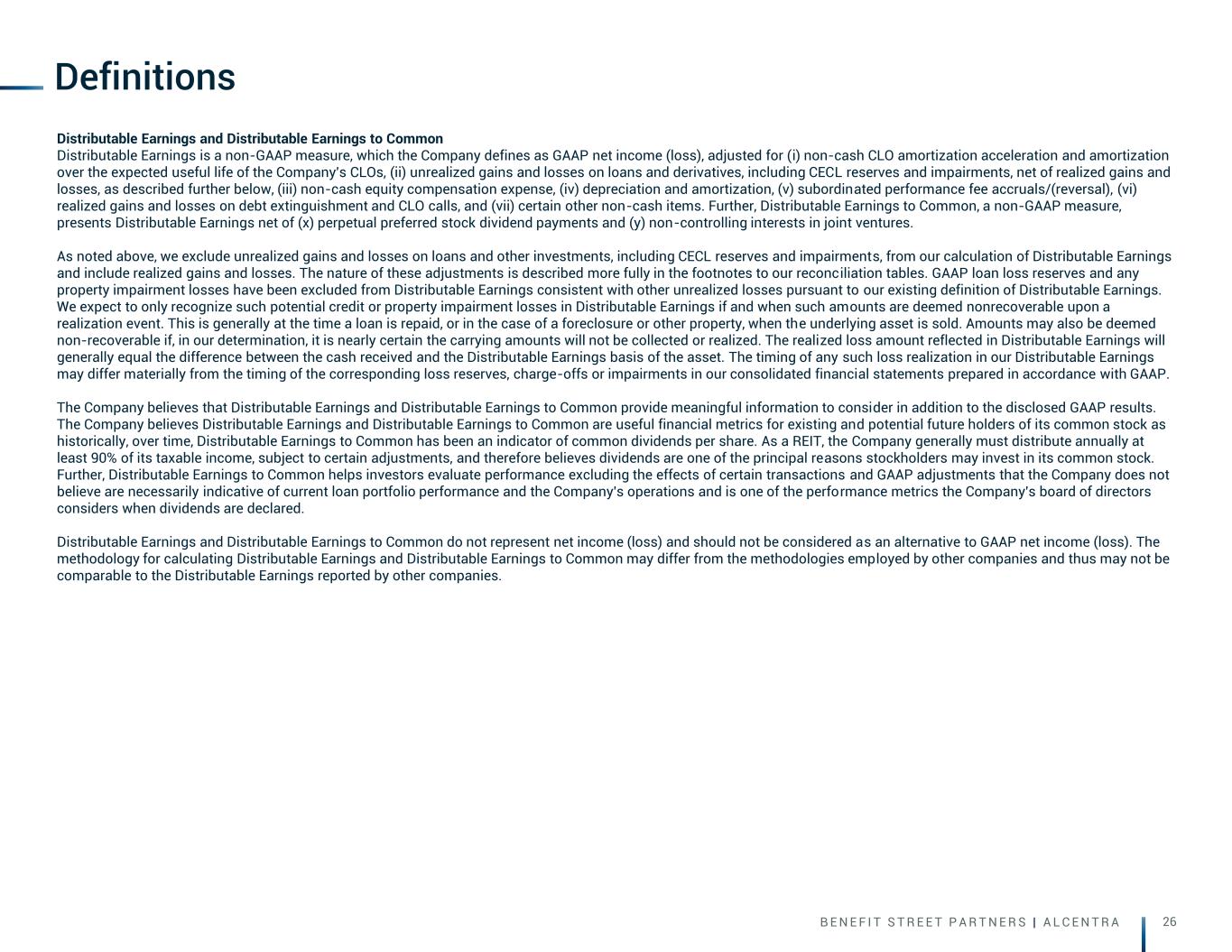 B E N E F I T S T R E E T P A R T N E R S | A L C E N T R A 26 Definitions Distributable Earnings and Distributable Earnings to Common Distributable Earnings is a non-GAAP measure, which the Company defines as GAAP net income (loss), adjusted for (i) non-cash CLO amortization acceleration and amortization over the expected useful life of the Company's CLOs, (ii) unrealized gains and losses on loans and derivatives, including CECL reserves and impairments, net of realized gains and losses, as described further below, (iii) non-cash equity compensation expense, (iv) depreciation and amortization, (v) subordinated performance fee accruals/(reversal), (vi) realized gains and losses on debt extinguishment and CLO calls, and (vii) certain other non-cash items. Further, Distributable Earnings to Common, a non-GAAP measure, presents Distributable Earnings net of (x) perpetual preferred stock dividend payments and (y) non-controlling interests in joint ventures. As noted above, we exclude unrealized gains and losses on loans and other investments, including CECL reserves and impairments, from our calculation of Distributable Earnings and include realized gains and losses. The nature of these adjustments is described more fully in the footnotes to our reconciliation tables. GAAP loan loss reserves and any property impairment losses have been excluded from Distributable Earnings consistent with other unrealized losses pursuant to our existing definition of Distributable Earnings. We expect to only recognize such potential credit or property impairment losses in Distributable Earnings if and when such amounts are deemed nonrecoverable upon a realization event. This is generally at the time a loan is repaid, or in the case of a foreclosure or other property, when the underlying asset is sold. Amounts may also be deemed non-recoverable if, in our determination, it is nearly certain the carrying amounts will not be collected or realized. The realized loss amount reflected in Distributable Earnings will generally equal the difference between the cash received and the Distributable Earnings basis of the asset. The timing of any such loss realization in our Distributable Earnings may differ materially from the timing of the corresponding loss reserves, charge-offs or impairments in our consolidated financial statements prepared in accordance with GAAP. The Company believes that Distributable Earnings and Distributable Earnings to Common provide meaningful information to consider in addition to the disclosed GAAP results. The Company believes Distributable Earnings and Distributable Earnings to Common are useful financial metrics for existing and potential future holders of its common stock as historically, over time, Distributable Earnings to Common has been an indicator of common dividends per share. As a REIT, the Company generally must distribute annually at least 90% of its taxable income, subject to certain adjustments, and therefore believes dividends are one of the principal reasons stockholders may invest in its common stock. Further, Distributable Earnings to Common helps investors evaluate performance excluding the effects of certain transactions and GAAP adjustments that the Company does not believe are necessarily indicative of current loan portfolio performance and the Company's operations and is one of the performance metrics the Company's board of directors considers when dividends are declared. Distributable Earnings and Distributable Earnings to Common do not represent net income (loss) and should not be considered as an alternative to GAAP net income (loss). The methodology for calculating Distributable Earnings and Distributable Earnings to Common may differ from the methodologies employed by other companies and thus may not be comparable to the Distributable Earnings reported by other companies.