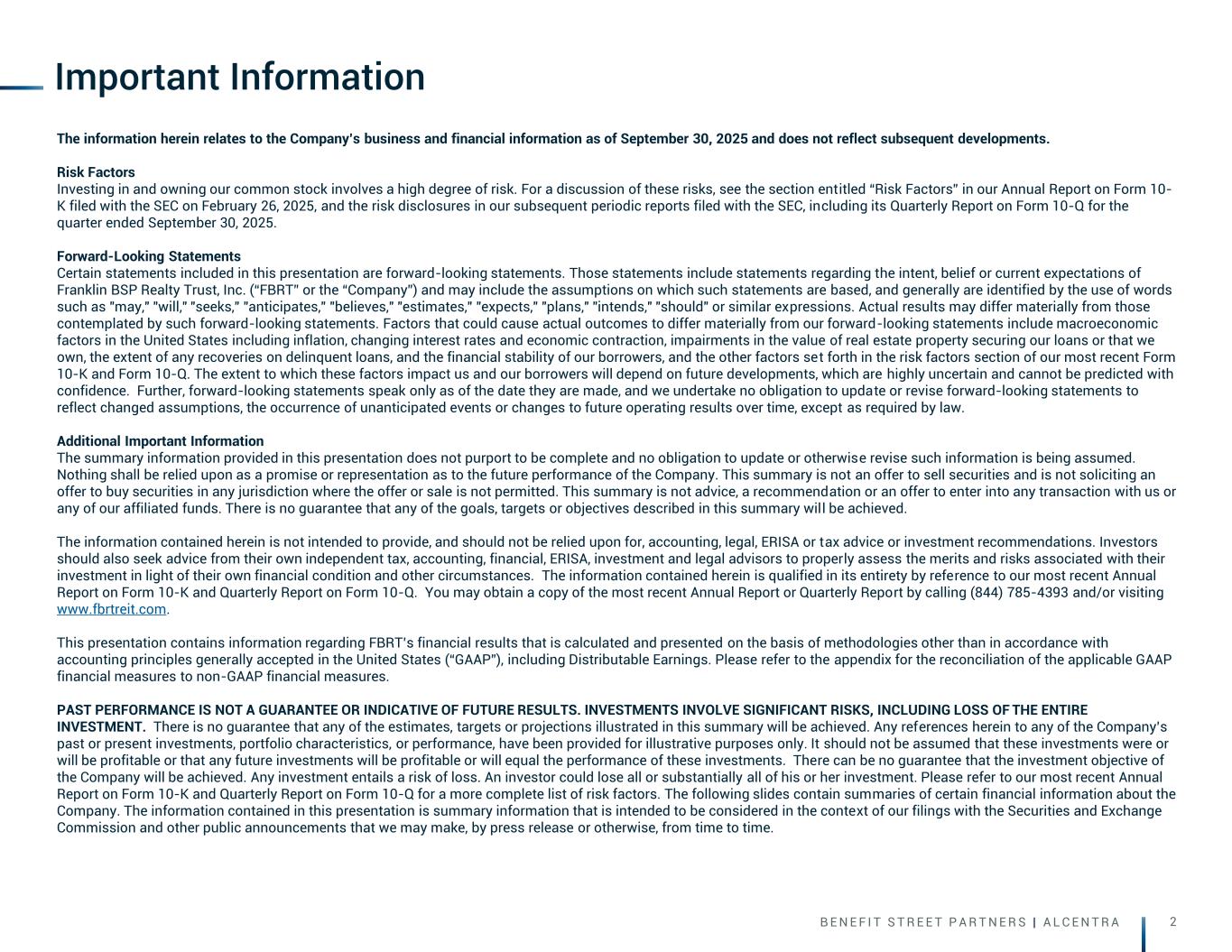 B E N E F I T S T R E E T P A R T N E R S | A L C E N T R A 2 Important Information The information herein relates to the Company’s business and financial information as of September 30, 2025 and does not reflect subsequent developments. Risk Factors Investing in and owning our common stock involves a high degree of risk. For a discussion of these risks, see the section entitled “Risk Factors” in our Annual Report on Form 10- K filed with the SEC on February 26, 2025, and the risk disclosures in our subsequent periodic reports filed with the SEC, including its Quarterly Report on Form 10-Q for the quarter ended September 30, 2025. Forward-Looking Statements Certain statements included in this presentation are forward-looking statements. Those statements include statements regarding the intent, belief or current expectations of Franklin BSP Realty Trust, Inc. (“FBRT” or the “Company”) and may include the assumptions on which such statements are based, and generally are identified by the use of words such as "may," "will," "seeks," "anticipates," "believes," "estimates," "expects," "plans," "intends," "should" or similar expressions. Actual results may differ materially from those contemplated by such forward-looking statements. Factors that could cause actual outcomes to differ materially from our forward-looking statements include macroeconomic factors in the United States including inflation, changing interest rates and economic contraction, impairments in the value of real estate property securing our loans or that we own, the extent of any recoveries on delinquent loans, and the financial stability of our borrowers, and the other factors set forth in the risk factors section of our most recent Form 10-K and Form 10-Q. The extent to which these factors impact us and our borrowers will depend on future developments, which are highly uncertain and cannot be predicted with confidence. Further, forward-looking statements speak only as of the date they are made, and we undertake no obligation to update or revise forward-looking statements to reflect changed assumptions, the occurrence of unanticipated events or changes to future operating results over time, except as required by law. Additional Important Information The summary information provided in this presentation does not purport to be complete and no obligation to update or otherwise revise such information is being assumed. Nothing shall be relied upon as a promise or representation as to the future performance of the Company. This summary is not an offer to sell securities and is not soliciting an offer to buy securities in any jurisdiction where the offer or sale is not permitted. This summary is not advice, a recommendation or an offer to enter into any transaction with us or any of our affiliated funds. There is no guarantee that any of the goals, targets or objectives described in this summary will be achieved. The information contained herein is not intended to provide, and should not be relied upon for, accounting, legal, ERISA or tax advice or investment recommendations. Investors should also seek advice from their own independent tax, accounting, financial, ERISA, investment and legal advisors to properly assess the merits and risks associated with their investment in light of their own financial condition and other circumstances. The information contained herein is qualified in its entirety by reference to our most recent Annual Report on Form 10-K and Quarterly Report on Form 10-Q. You may obtain a copy of the most recent Annual Report or Quarterly Report by calling (844) 785-4393 and/or visiting www.fbrtreit.com. This presentation contains information regarding FBRT’s financial results that is calculated and presented on the basis of methodologies other than in accordance with accounting principles generally accepted in the United States (“GAAP”), including Distributable Earnings. Please refer to the appendix for the reconciliation of the applicable GAAP financial measures to non-GAAP financial measures. PAST PERFORMANCE IS NOT A GUARANTEE OR INDICATIVE OF FUTURE RESULTS. INVESTMENTS INVOLVE SIGNIFICANT RISKS, INCLUDING LOSS OF THE ENTIRE INVESTMENT. There is no guarantee that any of the estimates, targets or projections illustrated in this summary will be achieved. Any references herein to any of the Company’s past or present investments, portfolio characteristics, or performance, have been provided for illustrative purposes only. It should not be assumed that these investments were or will be profitable or that any future investments will be profitable or will equal the performance of these investments. There can be no guarantee that the investment objective of the Company will be achieved. Any investment entails a risk of loss. An investor could lose all or substantially all of his or her investment. Please refer to our most recent Annual Report on Form 10-K and Quarterly Report on Form 10-Q for a more complete list of risk factors. The following slides contain summaries of certain financial information about the Company. The information contained in this presentation is summary information that is intended to be considered in the context of our filings with the Securities and Exchange Commission and other public announcements that we may make, by press release or otherwise, from time to time.