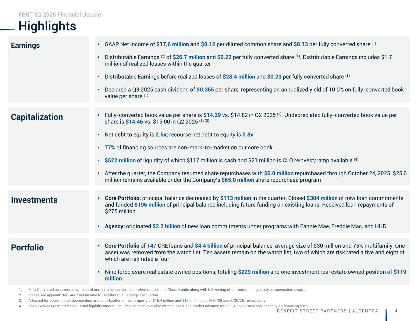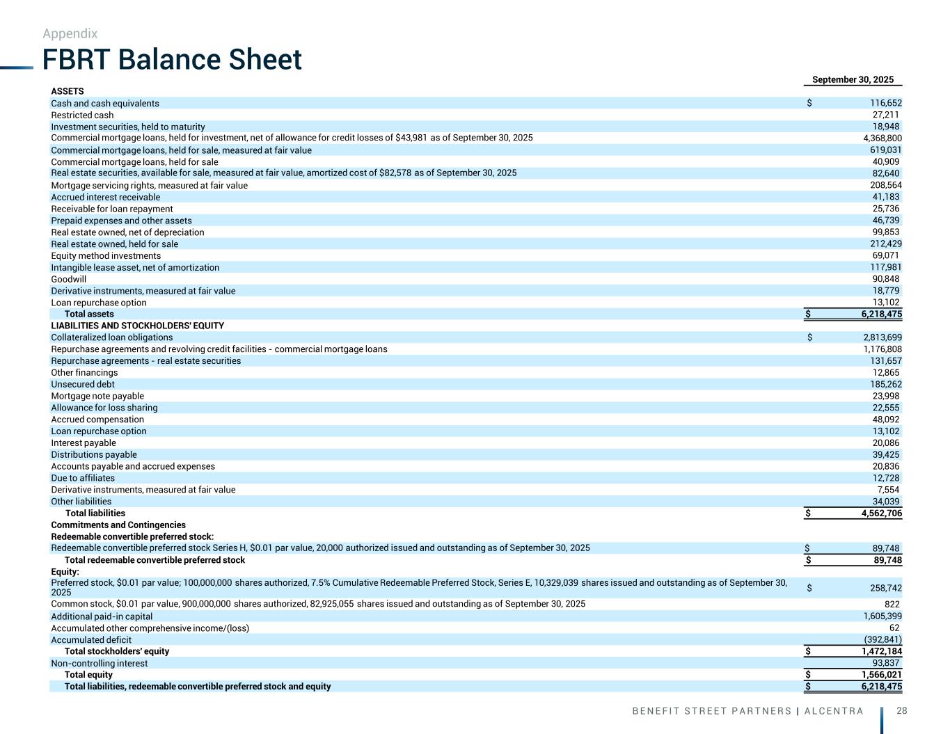 B E N E F I T S T R E E T P A R T N E R S | A L C E N T R A 28 September 30, 2025 ASSETS Cash and cash equivalents $ 116,652 Restricted cash 27,211 Investment securities, held to maturity 18,948 Commercial mortgage loans, held for investment, net of allowance for credit losses of $43,981 as of September 30, 2025 4,368,800 Commercial mortgage loans, held for sale, measured at fair value 619,031 Commercial mortgage loans, held for sale 40,909 Real estate securities, available for sale, measured at fair value, amortized cost of $82,578 as of September 30, 2025 82,640 Mortgage servicing rights, measured at fair value 208,564 Accrued interest receivable 41,183 Receivable for loan repayment 25,736 Prepaid expenses and other assets 46,739 Real estate owned, net of depreciation 99,853 Real estate owned, held for sale 212,429 Equity method investments 69,071 Intangible lease asset, net of amortization 117,981 Goodwill 90,848 Derivative instruments, measured at fair value 18,779 Loan repurchase option 13,102 Total assets $ 6,218,475 LIABILITIES AND STOCKHOLDERS' EQUITY Collateralized loan obligations $ 2,813,699 Repurchase agreements and revolving credit facilities - commercial mortgage loans 1,176,808 Repurchase agreements - real estate securities 131,657 Other financings 12,865 Unsecured debt 185,262 Mortgage note payable 23,998 Allowance for loss sharing 22,555 Accrued compensation 48,092 Loan repurchase option 13,102 Interest payable 20,086 Distributions payable 39,425 Accounts payable and accrued expenses 20,836 Due to affiliates 12,728 Derivative instruments, measured at fair value 7,554 Other liabilities 34,039 Total liabilities $ 4,562,706 Commitments and Contingencies Redeemable convertible preferred stock: Redeemable convertible preferred stock Series H, $0.01 par value, 20,000 authorized issued and outstanding as of September 30, 2025 $ 89,748 Total redeemable convertible preferred stock $ 89,748 Equity: Preferred stock, $0.01 par value; 100,000,000 shares authorized, 7.5% Cumulative Redeemable Preferred Stock, Series E, 10,329,039 shares issued and outstanding as of September 30, 2025 $ 258,742 Common stock, $0.01 par value, 900,000,000 shares authorized, 82,925,055 shares issued and outstanding as of September 30, 2025 822 Additional paid-in capital 1,605,399 Accumulated other comprehensive income/(loss) 62 Accumulated deficit (392,841) Total stockholders' equity $ 1,472,184 Non-controlling interest 93,837 Total equity $ 1,566,021 Total liabilities, redeemable convertible preferred stock and equity $ 6,218,475 FBRT Balance Sheet Appendix