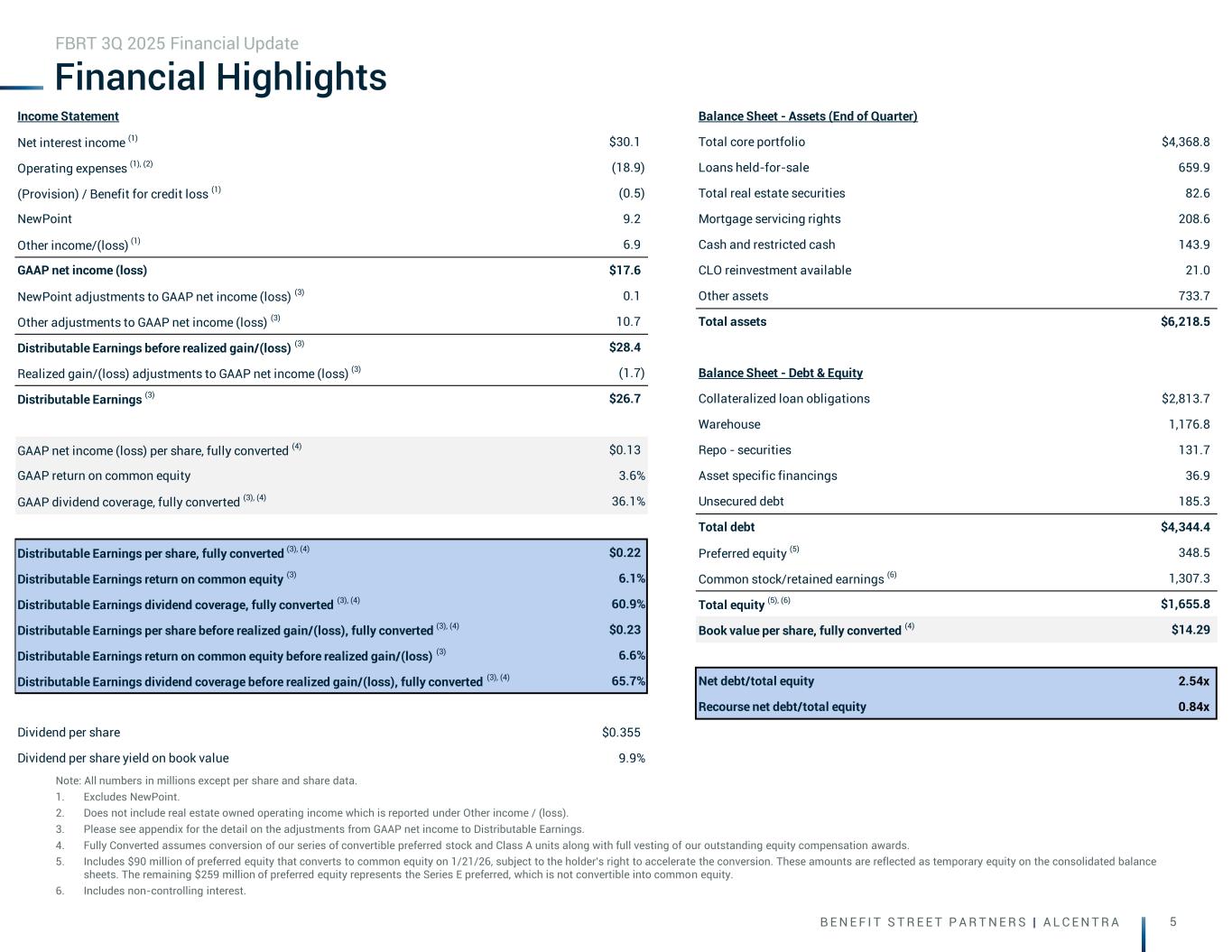 B E N E F I T S T R E E T P A R T N E R S | A L C E N T R A 4 Highlights FBRT 3Q 2025 Financial Update • Fully-converted book value per share is $14.29 vs. $14.82 in Q2 2025 (1). Undepreciated fully-converted book value per share is $14.46 vs. $15.00 in Q2 2025 (1) (3) • Net debt to equity is 2.5x; recourse net debt to equity is 0.8x • 77% of financing sources are non-mark-to-market on our core book • $522 million of liquidity of which $117 million is cash and $21 million is CLO reinvest/ramp available (4) • After the quarter, the Company resumed share repurchases with $6.0 million repurchased through October 24, 2025. $25.6 million remains available under the Company’s $65.0 million share repurchase program • Core Portfolio: principal balance decreased by $113 million in the quarter. Closed $304 million of new loan commitments and funded $196 million of principal balance including future funding on existing loans. Received loan repayments of $275 million • Agency: originated $2.2 billion of new loan commitments under programs with Fannie Mae, Freddie Mac, and HUD • Core Portfolio of 147 CRE loans and $4.4 billion of principal balance, average size of $30 million and 75% multifamily. One asset was removed from the watch list. Ten assets remain on the watch list, two of which are risk rated a five and eight of which are risk rated a four • Nine foreclosure real estate owned positions, totaling $229 million and one investment real estate owned position of $119 million Capitalization Investments Portfolio Earnings • GAAP Net Income of $17.6 million and $0.12 per diluted common share and $0.13 per fully converted share (1) • Distributable Earnings (2) of $26.7 million and $0.22 per fully converted share (1). Distributable Earnings includes $1.7 million of realized losses within the quarter • Distributable Earnings before realized losses of $28.4 million and $0.23 per fully converted share (1) • Declared a Q3 2025 cash dividend of $0.355 per share, representing an annualized yield of 10.0% on fully-converted book value per share (1) 1. Fully Converted assumes conversion of our series of convertible preferred stock and Class A units along with full vesting of our outstanding equity compensation awards. 2. Please see appendix for GAAP net income to Distributable Earnings calculation. 3. Adjusted for accumulated depreciation and amortization of real property of $16.4 million and $16.0 million at 9/30/25 and 6/30/25, respectively. 4. Cash excludes restricted cash. Total liquidity amount includes the cash available we can invest at a market advance rate utilizing our available capacity on financing lines.