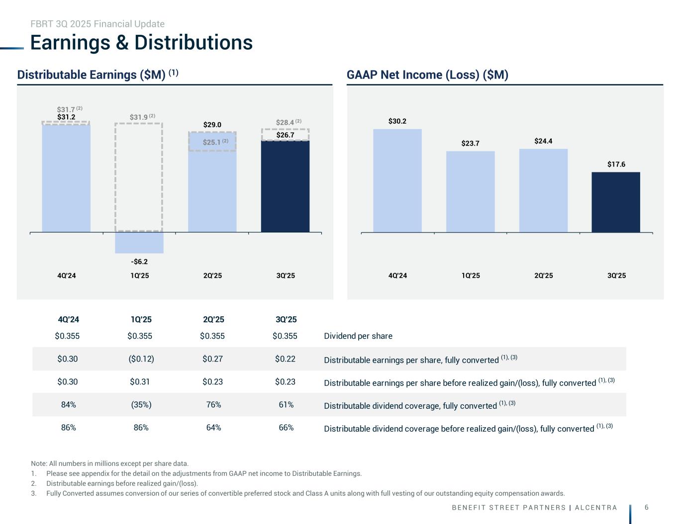 B E N E F I T S T R E E T P A R T N E R S | A L C E N T R A 5 Income Statement Balance Sheet - Assets (End of Quarter) Net interest income (1) $30.1 Total core portfolio $4,368.8 Operating expenses (1), (2) (18.9) Loans held-for-sale 659.9 (Provision) / Benefit for credit loss (1) (0.5) Total real estate securities 82.6 NewPoint 9.2 Mortgage servicing rights 208.6 Other income/(loss) (1) 6.9 Cash and restricted cash 143.9 GAAP net income (loss) $17.6 CLO reinvestment available 21.0 NewPoint adjustments to GAAP net income (loss) (3) 0.1 Other assets 733.7 Other adjustments to GAAP net income (loss) (3) 10.7 Total assets $6,218.5 Distributable Earnings before realized gain/(loss) (3) $28.4 Realized gain/(loss) adjustments to GAAP net income (loss) (3) (1.7) Balance Sheet - Debt & Equity Distributable Earnings (3) $26.7 Collateralized loan obligations $2,813.7 Warehouse 1,176.8 GAAP net income (loss) per share, fully converted (4) $0.13 Repo - securities 131.7 GAAP return on common equity 3.6% Asset specific financings 36.9 GAAP dividend coverage, fully converted (3), (4) 36.1% Unsecured debt 185.3 Total debt $4,344.4 Distributable Earnings per share, fully converted (3), (4) $0.22 Preferred equity (5) 348.5 Distributable Earnings return on common equity (3) 6.1% Common stock/retained earnings (6) 1,307.3 Distributable Earnings dividend coverage, fully converted (3), (4) 60.9% Total equity (5), (6) $1,655.8 Distributable Earnings per share before realized gain/(loss), fully converted (3), (4) $0.23 Book value per share, fully converted (4) $14.29 Distributable Earnings return on common equity before realized gain/(loss) (3) 6.6% Distributable Earnings dividend coverage before realized gain/(loss), fully converted (3), (4) 65.7% Net debt/total equity 2.54x Recourse net debt/total equity 0.84x Dividend per share $0.355 Dividend per share yield on book value 9.9% Financial Highlights Note: All numbers in millions except per share and share data. 1. Excludes NewPoint. 2. Does not include real estate owned operating income which is reported under Other income / (loss). 3. Please see appendix for the detail on the adjustments from GAAP net income to Distributable Earnings. 4. Fully Converted assumes conversion of our series of convertible preferred stock and Class A units along with full vesting of our outstanding equity compensation awards. 5. Includes $90 million of preferred equity that converts to common equity on 1/21/26, subject to the holder's right to accelerate the conversion. These amounts are reflected as temporary equity on the consolidated balance sheets. The remaining $259 million of preferred equity represents the Series E preferred, which is not convertible into common equity. 6. Includes non-controlling interest. FBRT 3Q 2025 Financial Update