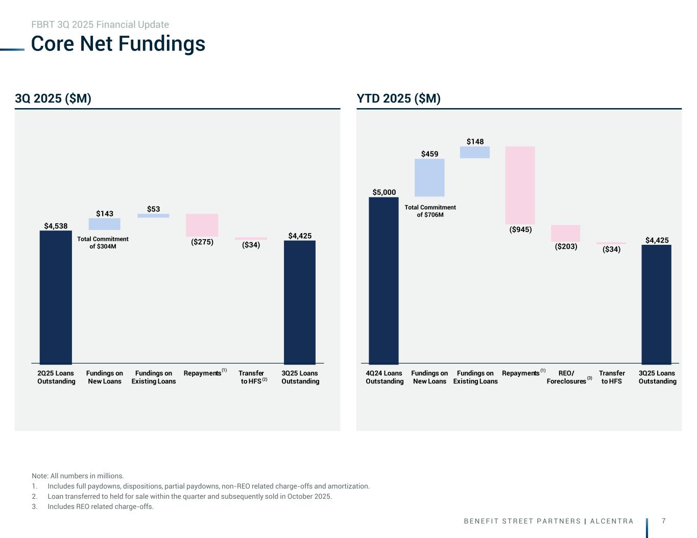 B E N E F I T S T R E E T P A R T N E R S | A L C E N T R A 6 $31.2 -$6.2 $29.0 $26.7 4Q'24 1Q'25 2Q'25 3Q'25 $31.9 (2) $28.4 (2) $36.0 $31.7 (2) $25.1 (2) $30.2 $23.7 $24.4 $17.6 4Q'24 1Q'25 2Q'25 3Q'25 4Q'24 1Q'25 2Q'25 3Q'25 $0.355 $0.355 $0.355 $0.355 Dividend per share $0.30 ($0.12) $0.27 $0.22 Distributable earnings per share, fully converted (1), (3) $0.30 $0.31 $0.23 $0.23 Distributable earnings per share before realized gain/(loss), fully converted (1), (3) 84% (35%) 76% 61% Distributable dividend coverage, fully converted (1), (3) 86% 86% 64% 66% Distributable dividend coverage before realized gain/(loss), fully converted (1), (3) Earnings & Distributions Note: All numbers in millions except per share data. 1. Please see appendix for the detail on the adjustments from GAAP net income to Distributable Earnings. 2. Distributable earnings before realized gain/(loss). 3. Fully Converted assumes conversion of our series of convertible preferred stock and Class A units along with full vesting of our outstanding equity compensation awards. FBRT 3Q 2025 Financial Update Distributable Earnings ($M) (1) GAAP Net Income (Loss) ($M)