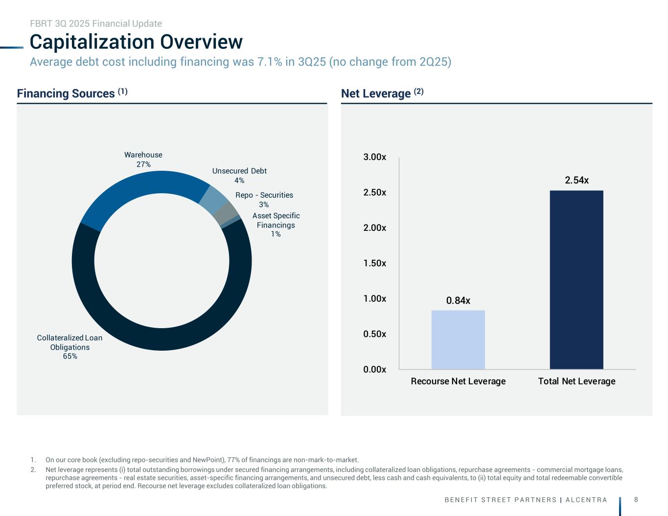 B E N E F I T S T R E E T P A R T N E R S | A L C E N T R A 8 Capitalization Overview 1. On our core book (excluding repo-securities and NewPoint), 77% of financings are non-mark-to-market. 2. Net leverage represents (i) total outstanding borrowings under secured financing arrangements, including collateralized loan obligations, repurchase agreements - commercial mortgage loans, repurchase agreements - real estate securities, asset-specific financing arrangements, and unsecured debt, less cash and cash equivalents, to (ii) total equity and total redeemable convertible preferred stock, at period end. Recourse net leverage excludes collateralized loan obligations. FBRT 3Q 2025 Financial Update Financing Sources (1) Net Leverage (2) Average debt cost including financing was 7.1% in 3Q25 (no change from 2Q25) Collateralized Loan Obligations 65% Warehouse 27% Unsecured Debt 4% Repo - Securities 3% Asset Specific Financings 1% 0.84x 2.54x 0.00x 0.50x 1.00x 1.50x 2.00x 2.50x 3.00x Recourse Net Leverage Total Net Leverage