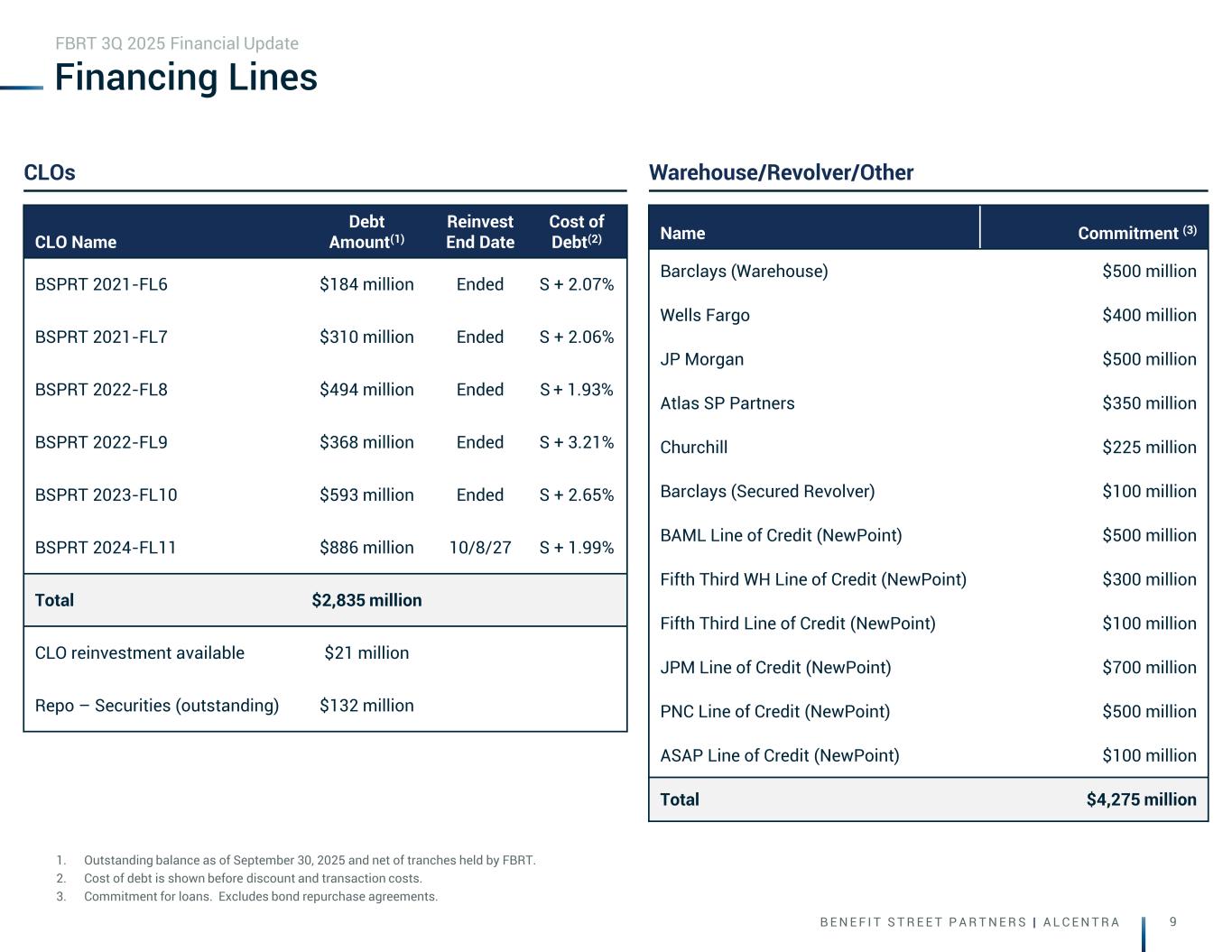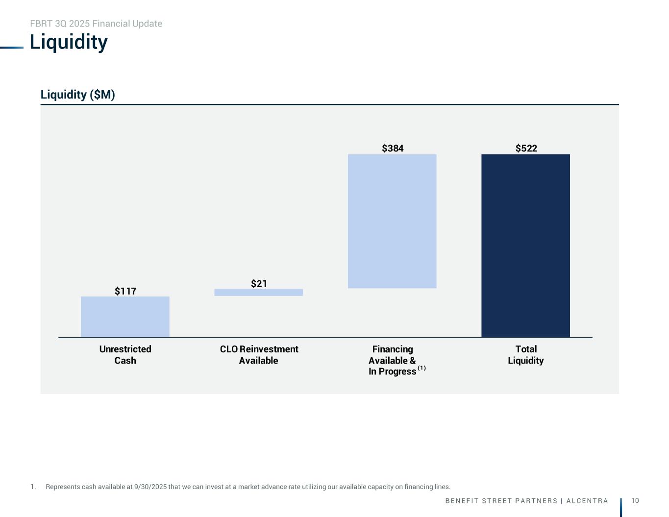 B E N E F I T S T R E E T P A R T N E R S | A L C E N T R A 9 Financing Lines 1. Outstanding balance as of September 30, 2025 and net of tranches held by FBRT. 2. Cost of debt is shown before discount and transaction costs. 3. Commitment for loans. Excludes bond repurchase agreements. FBRT 3Q 2025 Financial Update CLOs Warehouse/Revolver/Other CLO Name Debt Amount(1) Reinvest End Date Cost of Debt(2) BSPRT 2021-FL6 $184 million Ended S + 2.07% BSPRT 2021-FL7 $310 million Ended S + 2.06% BSPRT 2022-FL8 $494 million Ended S + 1.93% BSPRT 2022-FL9 $368 million Ended S + 3.21% BSPRT 2023-FL10 $593 million Ended S + 2.65% BSPRT 2024-FL11 $886 million 10/8/27 S + 1.99% Total $2,835 million CLO reinvestment available $21 million Repo – Securities (outstanding) $132 million Name Commitment (3) Barclays (Warehouse) $500 million Wells Fargo $400 million JP Morgan $500 million Atlas SP Partners $350 million Churchill $225 million Barclays (Secured Revolver) $100 million BAML Line of Credit (NewPoint) $500 million Fifth Third WH Line of Credit (NewPoint) $300 million Fifth Third Line of Credit (NewPoint) $100 million JPM Line of Credit (NewPoint) $700 million PNC Line of Credit (NewPoint) $500 million ASAP Line of Credit (NewPoint) $100 million Total $4,275 million