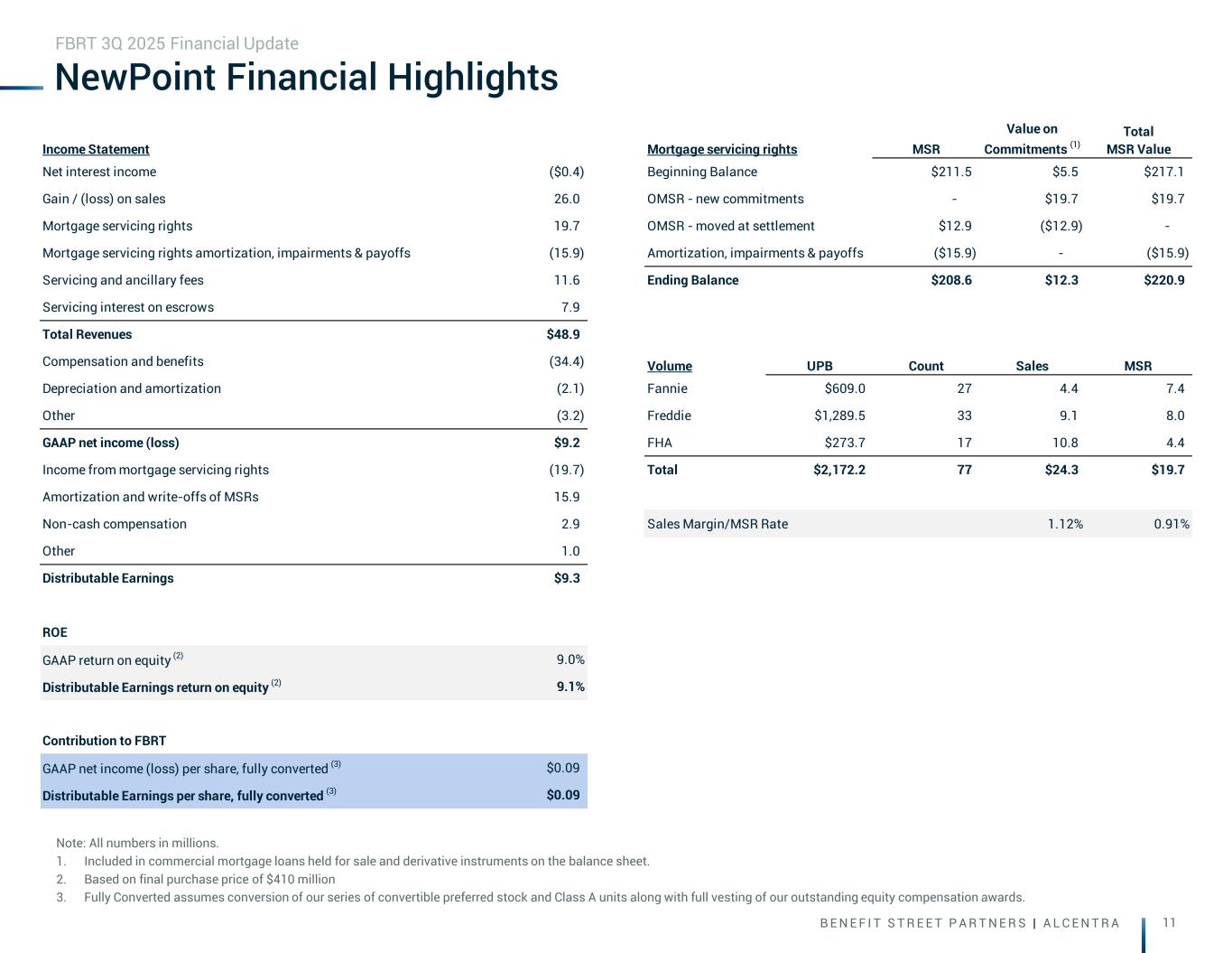 B E N E F I T S T R E E T P A R T N E R S | A L C E N T R A 11 NewPoint Financial Highlights Note: All numbers in millions. 1. Included in commercial mortgage loans held for sale and derivative instruments on the balance sheet. 2. Based on final purchase price of $410 million 3. Fully Converted assumes conversion of our series of convertible preferred stock and Class A units along with full vesting of our outstanding equity compensation awards. FBRT 3Q 2025 Financial Update Income Statement Mortgage servicing rights MSR Value on Commitments (1) Total MSR Value Net interest income ($0.4) Beginning Balance $211.5 $5.5 $217.1 Gain / (loss) on sales 26.0 OMSR - new commitments - $19.7 $19.7 Mortgage servicing rights 19.7 OMSR - moved at settlement $12.9 ($12.9) - Mortgage servicing rights amortization, impairments & payoffs (15.9) Amortization, impairments & payoffs ($15.9) - ($15.9) Servicing and ancillary fees 11.6 Ending Balance $208.6 $12.3 $220.9 Servicing interest on escrows 7.9 Total Revenues $48.9 Compensation and benefits (34.4) Volume UPB Count Sales MSR Depreciation and amortization (2.1) Fannie $609.0 27 4.4 7.4 Other (3.2) Freddie $1,289.5 33 9.1 8.0 GAAP net income (loss) $9.2 FHA $273.7 17 10.8 4.4 Income from mortgage servicing rights (19.7) Total $2,172.2 77 $24.3 $19.7 Amortization and write-offs of MSRs 15.9 Non-cash compensation 2.9 Sales Margin/MSR Rate 1.12% 0.91% Other 1.0 Distributable Earnings $9.3 ROE GAAP return on equity (2) 9.0% Distributable Earnings return on equity (2) 9.1% Contribution to FBRT GAAP net income (loss) per share, fully converted (3) $0.09 Distributable Earnings per share, fully converted (3) $0.09