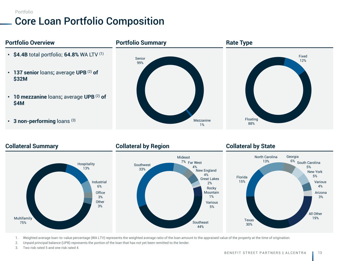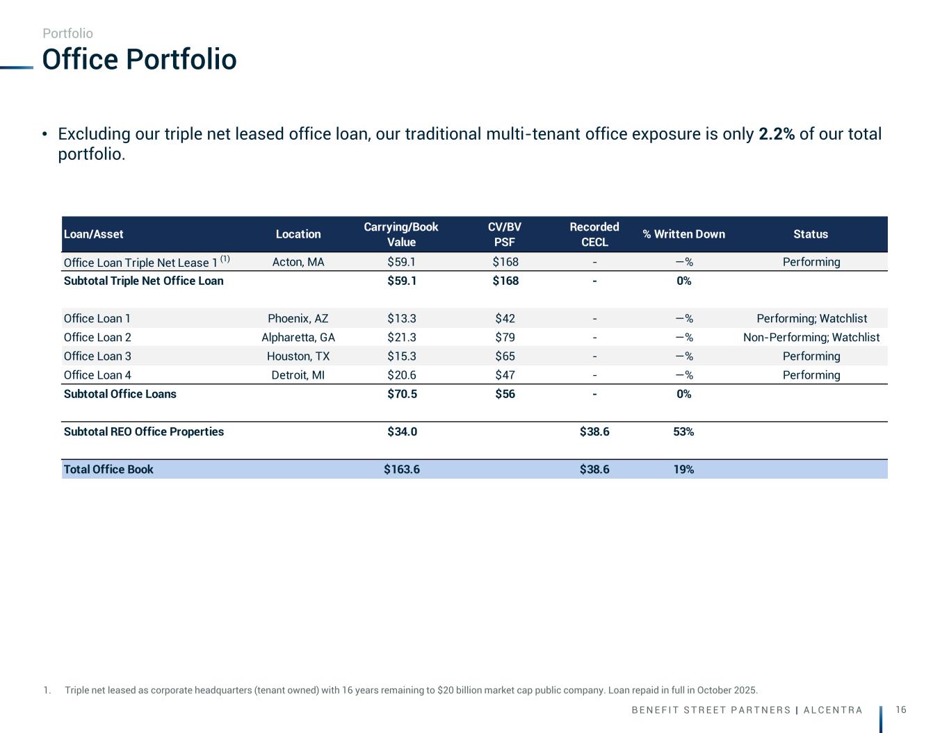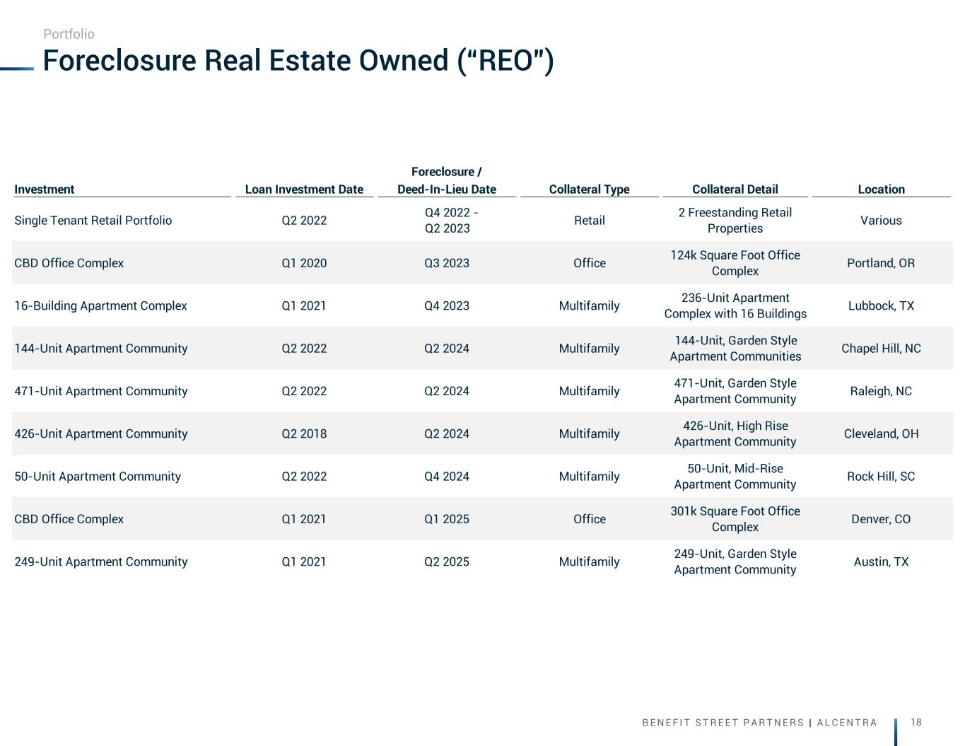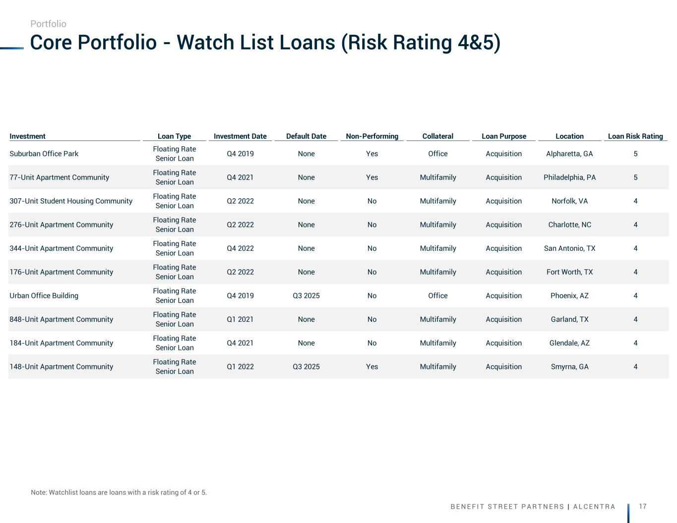 B E N E F I T S T R E E T P A R T N E R S | A L C E N T R A 17 Core Portfolio - Watch List Loans (Risk Rating 4&5) Note: Watchlist loans are loans with a risk rating of 4 or 5. Portfolio Investment Loan Type Investment Date Default Date Non-Performing Collateral Loan Purpose Location Loan Risk Rating Suburban Office Park Floating Rate Senior Loan Q4 2019 None Yes Office Acquisition Alpharetta, GA 5 77-Unit Apartment Community Floating Rate Senior Loan Q4 2021 None Yes Multifamily Acquisition Philadelphia, PA 5 307-Unit Student Housing Community Floating Rate Senior Loan Q2 2022 None No Multifamily Acquisition Norfolk, VA 4 276-Unit Apartment Community Floating Rate Senior Loan Q2 2022 None No Multifamily Acquisition Charlotte, NC 4 344-Unit Apartment Community Floating Rate Senior Loan Q4 2022 None No Multifamily Acquisition San Antonio, TX 4 176-Unit Apartment Community Floating Rate Senior Loan Q2 2022 None No Multifamily Acquisition Fort Worth, TX 4 Urban Office Building Floating Rate Senior Loan Q4 2019 Q3 2025 No Office Acquisition Phoenix, AZ 4 848-Unit Apartment Community Floating Rate Senior Loan Q1 2021 None No Multifamily Acquisition Garland, TX 4 184-Unit Apartment Community Floating Rate Senior Loan Q4 2021 None No Multifamily Acquisition Glendale, AZ 4 148-Unit Apartment Community Floating Rate Senior Loan Q1 2022 Q3 2025 Yes Multifamily Acquisition Smyrna, GA 4