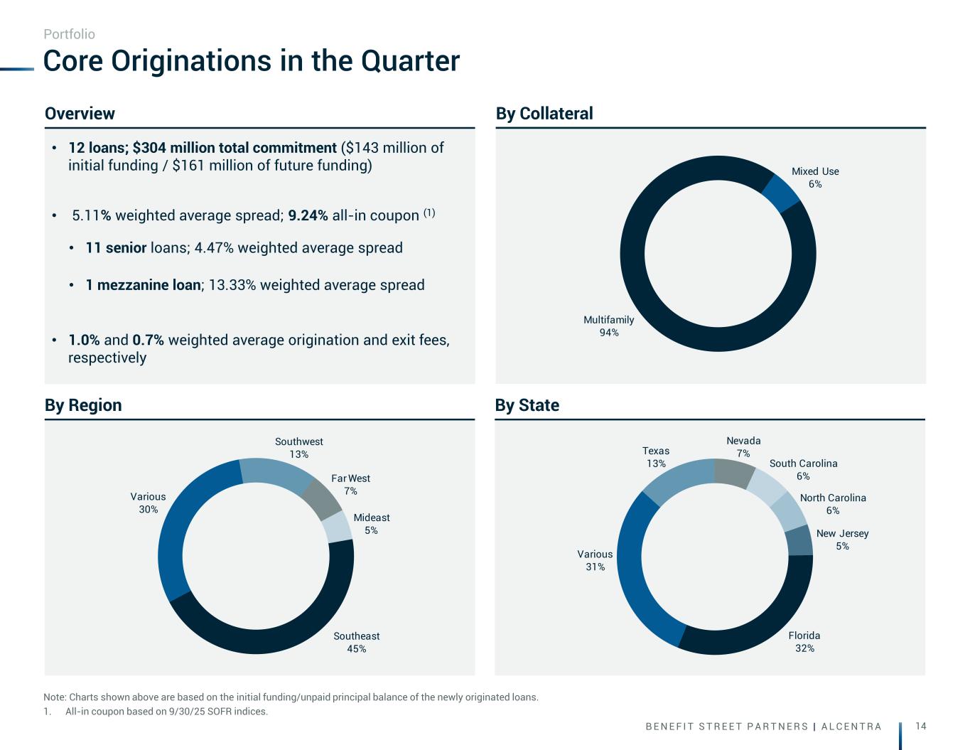 B E N E F I T S T R E E T P A R T N E R S | A L C E N T R A 13 Collateral by Region Texas 30% Florida 15% North Carolina 13% Georgia 6% South Carolina 5% New York 5% Various 4% Arizona 3% All Other 19% Core Loan Portfolio Composition 1. Weighted average loan-to-value percentage (WA LTV) represents the weighted average ratio of the loan amount to the appraised value of the property at the time of origination. 2. Unpaid principal balance (UPB) represents the portion of the loan that has not yet been remitted to the lender. 3. Two risk rated 5 and one risk rated 4. Portfolio Rate TypePortfolio Summary Collateral by StateCollateral Summary • $4.4B total portfolio; 64.8% WA LTV (1) • 137 senior loans; average UPB (2) of $32M • 10 mezzanine loans; average UPB (2) of $4M • 3 non-performing loans (3) Portfolio Overview Southeast 44% Southwest 33% Mideast 7% Far West 4% New England 4% Great Lakes 2% Rocky Mountain 1% Various 5% Floating 88% Fixed 12% Senior 99% Mezzanine 1% Multifamily 75% Hospitality 13% Industrial 6% Office 3% Other 3%