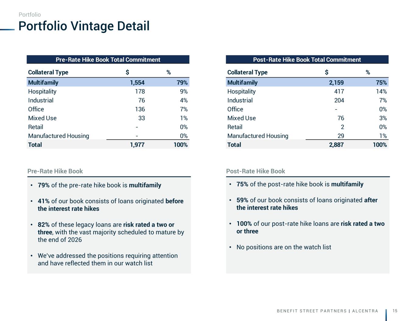 B E N E F I T S T R E E T P A R T N E R S | A L C E N T R A 14 By State By Collateral By Region Core Originations in the Quarter Note: Charts shown above are based on the initial funding/unpaid principal balance of the newly originated loans. 1. All-in coupon based on 9/30/25 SOFR indices. Portfolio • 12 loans; $304 million total commitment ($143 million of initial funding / $161 million of future funding) • 5.11% weighted average spread; 9.24% all-in coupon (1) • 11 senior loans; 4.47% weighted average spread • 1 mezzanine loan; 13.33% weighted average spread • 1.0% and 0.7% weighted average origination and exit fees, respectively Overview Southeast 45% Various 30% Southwest 13% Far West 7% Mideast 5% Florida 32% Various 31% Texas 13% Nevada 7% South Carolina 6% North Carolina 6% New Jersey 5% Multifamily 94% Mixed Use 6%
