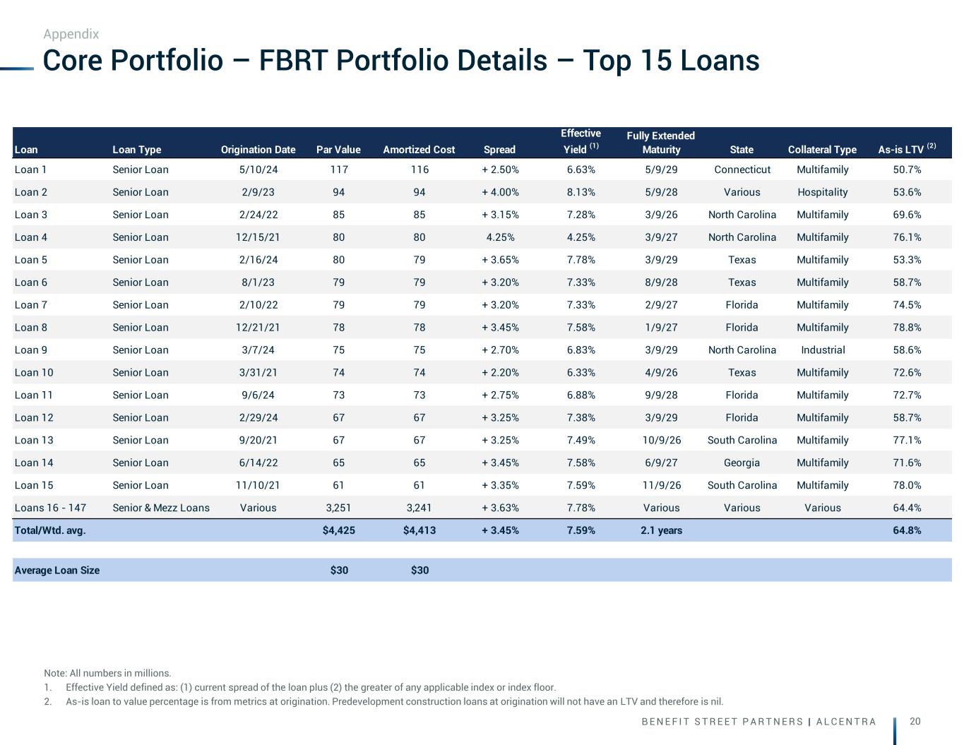 B E N E F I T S T R E E T P A R T N E R S | A L C E N T R A 20 Core Portfolio – FBRT Portfolio Details – Top 15 Loans Note: All numbers in millions. 1. Effective Yield defined as: (1) current spread of the loan plus (2) the greater of any applicable index or index floor. 2. As-is loan to value percentage is from metrics at origination. Predevelopment construction loans at origination will not have an LTV and therefore is nil. Appendix Loan Loan Type Origination Date Par Value Amortized Cost Spread Effective Yield (1) Fully Extended Maturity State Collateral Type As-is LTV (2) Loan 1 Senior Loan 5/10/24 117 116 + 2.50% 6.63% 5/9/29 Connecticut Multifamily 50.7% Loan 2 Senior Loan 2/9/23 94 94 + 4.00% 8.13% 5/9/28 Various Hospitality 53.6% Loan 3 Senior Loan 2/24/22 85 85 + 3.15% 7.28% 3/9/26 North Carolina Multifamily 69.6% Loan 4 Senior Loan 12/15/21 80 80 4.25% 4.25% 3/9/27 North Carolina Multifamily 76.1% Loan 5 Senior Loan 2/16/24 80 79 + 3.65% 7.78% 3/9/29 Texas Multifamily 53.3% Loan 6 Senior Loan 8/1/23 79 79 + 3.20% 7.33% 8/9/28 Texas Multifamily 58.7% Loan 7 Senior Loan 2/10/22 79 79 + 3.20% 7.33% 2/9/27 Florida Multifamily 74.5% Loan 8 Senior Loan 12/21/21 78 78 + 3.45% 7.58% 1/9/27 Florida Multifamily 78.8% Loan 9 Senior Loan 3/7/24 75 75 + 2.70% 6.83% 3/9/29 North Carolina Industrial 58.6% Loan 10 Senior Loan 3/31/21 74 74 + 2.20% 6.33% 4/9/26 Texas Multifamily 72.6% Loan 11 Senior Loan 9/6/24 73 73 + 2.75% 6.88% 9/9/28 Florida Multifamily 72.7% Loan 12 Senior Loan 2/29/24 67 67 + 3.25% 7.38% 3/9/29 Florida Multifamily 58.7% Loan 13 Senior Loan 9/20/21 67 67 + 3.25% 7.49% 10/9/26 South Carolina Multifamily 77.1% Loan 14 Senior Loan 6/14/22 65 65 + 3.45% 7.58% 6/9/27 Georgia Multifamily 71.6% Loan 15 Senior Loan 11/10/21 61 61 + 3.35% 7.59% 11/9/26 South Carolina Multifamily 78.0% Loans 16 - 147 Senior & Mezz Loans Various 3,251 3,241 + 3.63% 7.78% Various Various Various 64.4% Total/Wtd. avg. $4,425 $4,413 + 3.45% 7.59% 2.1 years 64.8% Average Loan Size $30 $30