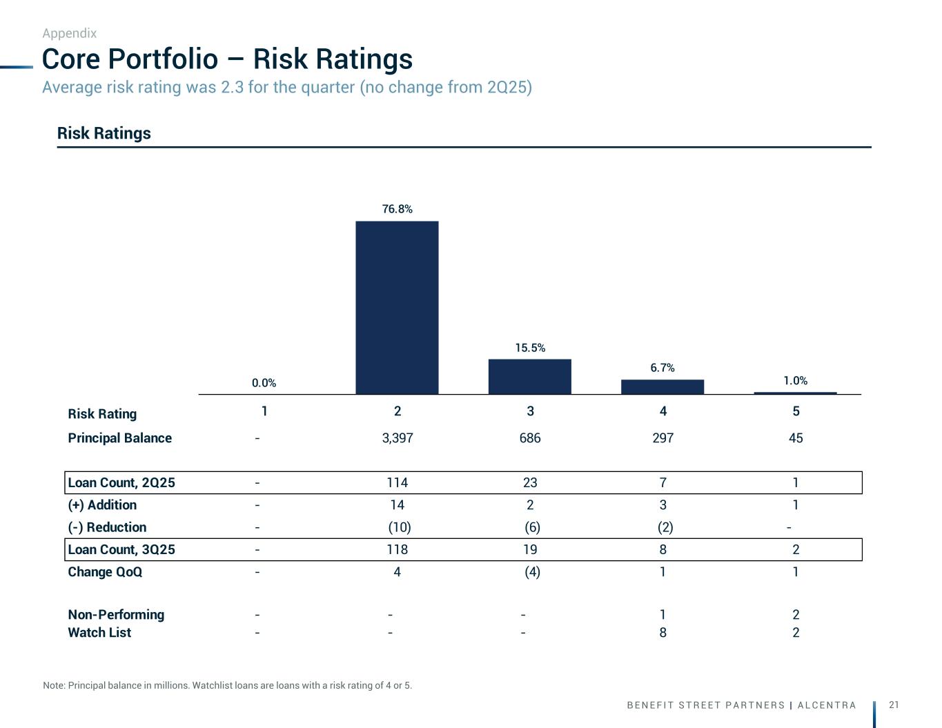 B E N E F I T S T R E E T P A R T N E R S | A L C E N T R A 21 Risk Rating Principal Balance - 3,397 686 297 45 Loan Count, 2Q25 - 114 23 7 1 (+) Addition - 14 2 3 1 (-) Reduction - (10) (6) (2) - Loan Count, 3Q25 - 118 19 8 2 Change QoQ - 4 (4) 1 1 Non-Performing - - - 1 2 Watch List - - - 8 2 0.0% 76.8% 15.5% 6.7% 1.0% 1 2 3 4 5 Core Portfolio – Risk Ratings Note: Principal balance in millions. Watchlist loans are loans with a risk rating of 4 or 5. Appendix Risk Ratings Average risk rating was 2.3 for the quarter (no change from 2Q25)