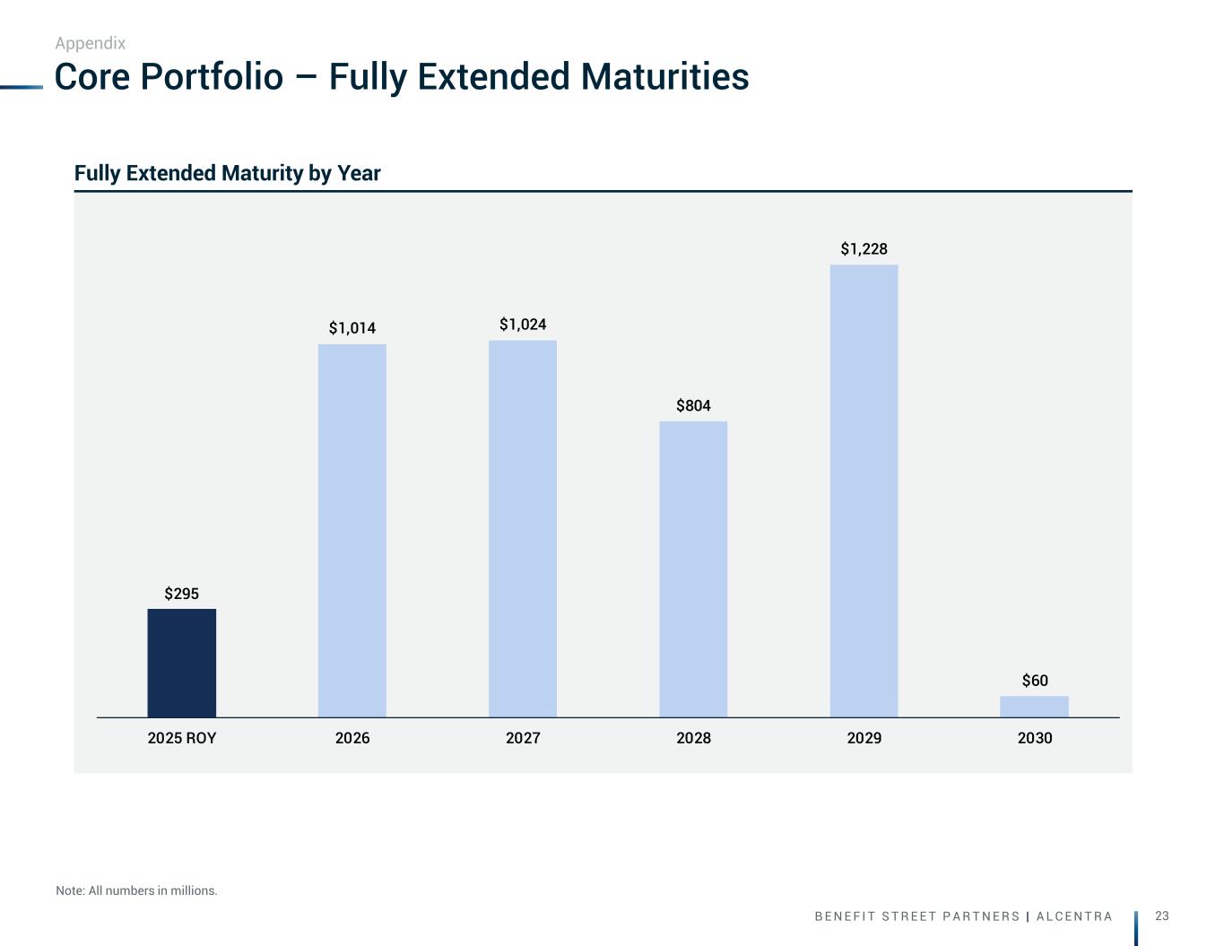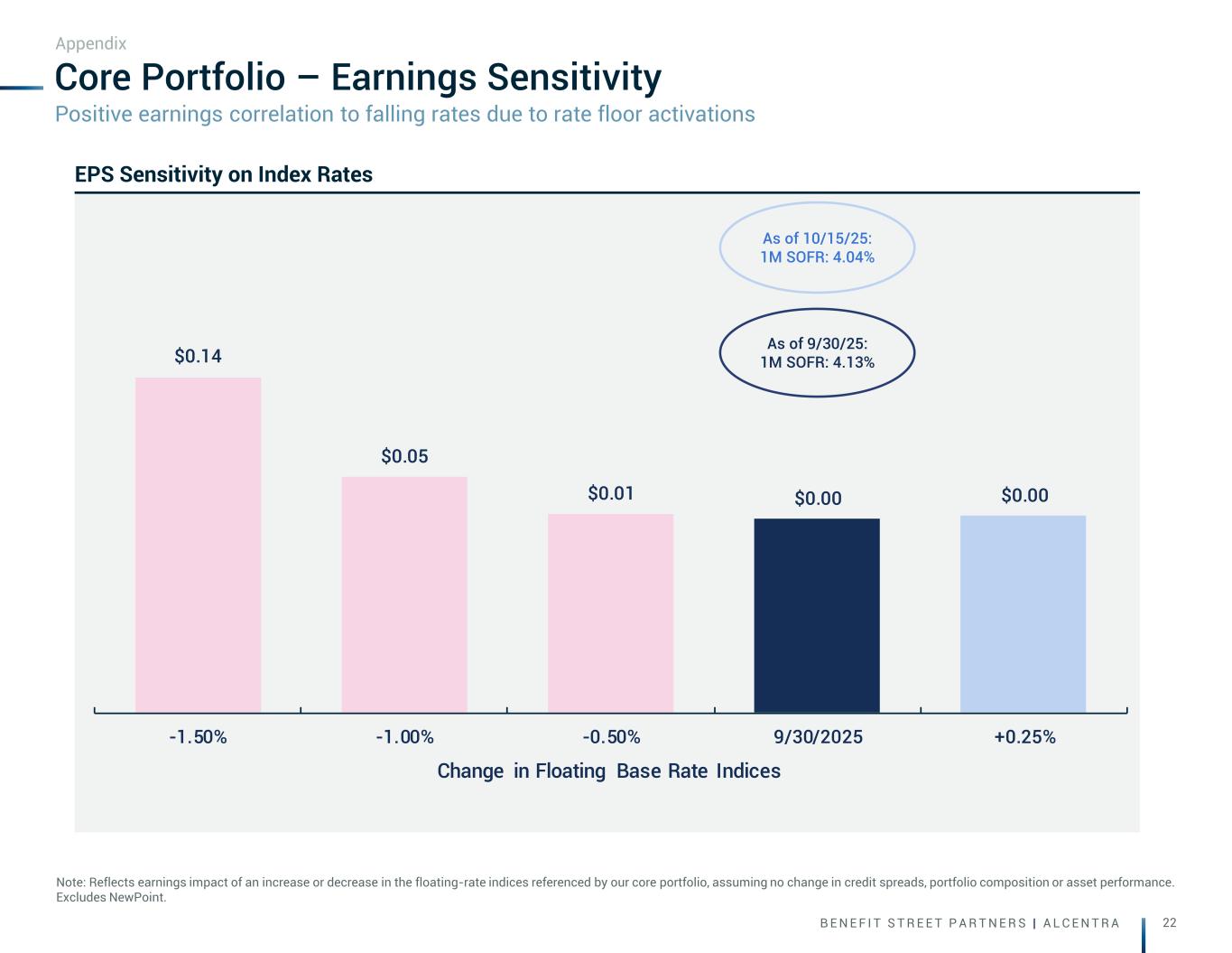 B E N E F I T S T R E E T P A R T N E R S | A L C E N T R A 22 $0.14 $0.05 $0.01 $0.00 $0.00 -1.50% -1.00% -0.50% 9/30/2025 +0.25% Change in Floating Base Rate Indices Core Portfolio – Earnings Sensitivity Note: Reflects earnings impact of an increase or decrease in the floating-rate indices referenced by our core portfolio, assuming no change in credit spreads, portfolio composition or asset performance. Excludes NewPoint. Appendix EPS Sensitivity on Index Rates Positive earnings correlation to falling rates due to rate floor activations As of 10/15/25: 1M SOFR: 4.04% As of 9/30/25: 1M SOFR: 4.13%
