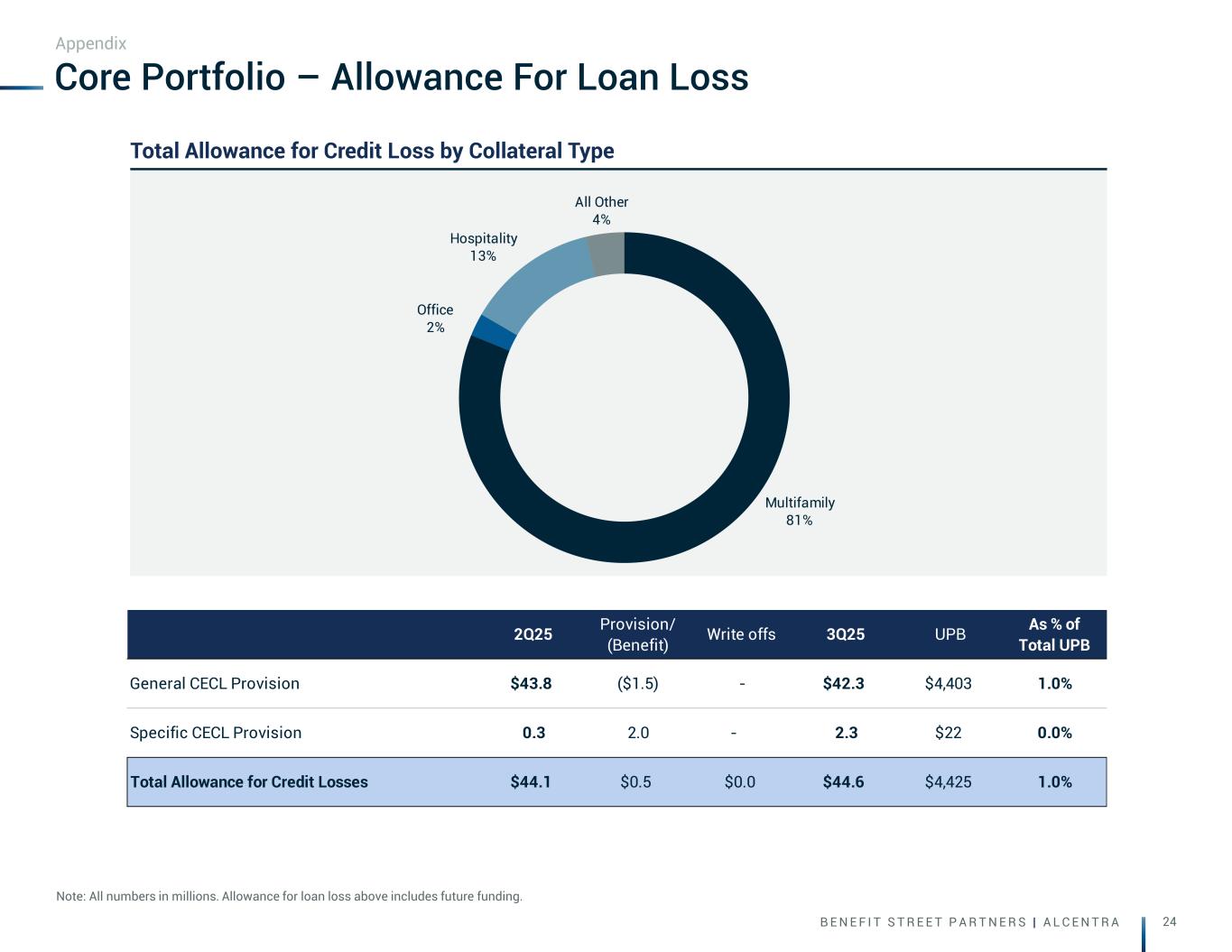 B E N E F I T S T R E E T P A R T N E R S | A L C E N T R A 24 Multifamily 81% Office 2% Hospitality 13% All Other 4% 2Q25 Provision/ (Benefit) Write offs 3Q25 UPB As % of Total UPB General CECL Provision $43.8 ($1.5) - $42.3 $4,403 1.0% Specific CECL Provision 0.3 2.0 - 2.3 $22 0.0% Total Allowance for Credit Losses $44.1 $0.5 $0.0 $44.6 $4,425 1.0% Core Portfolio – Allowance For Loan Loss Note: All numbers in millions. Allowance for loan loss above includes future funding. Appendix Total Allowance for Credit Loss by Collateral Type