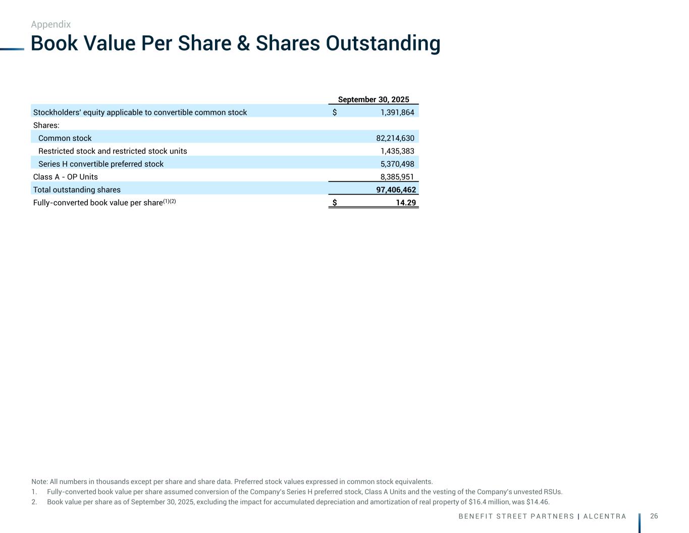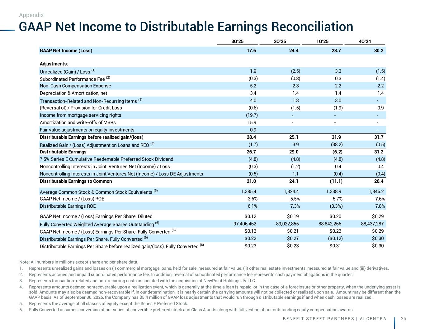 B E N E F I T S T R E E T P A R T N E R S | A L C E N T R A 25 GAAP Net Income to Distributable Earnings Reconciliation Note: All numbers in millions except share and per share data. 1. Represents unrealized gains and losses on (i) commercial mortgage loans, held for sale, measured at fair value, (ii) other real estate investments, measured at fair value and (iii) derivatives. 2. Represents accrued and unpaid subordinated performance fee. In addition, reversal of subordinated performance fee represents cash payment obligations in the quarter. 3. Represents transaction-related and non-recurring costs associated with the acquisition of NewPoint Holdings JV LLC 4. Represents amounts deemed nonrecoverable upon a realization event, which is generally at the time a loan is repaid, or in the case of a foreclosure or other property, when the underlying asset is sold. Amounts may also be deemed non-recoverable if, in our determination, it is nearly certain the carrying amounts will not be collected or realized upon sale. Amount may be different than the GAAP basis. As of September 30, 2025, the Company has $5.4 million of GAAP loss adjustments that would run through distributable earnings if and when cash losses are realized. 5. Represents the average of all classes of equity except the Series E Preferred Stock. 6. Fully Converted assumes conversion of our series of convertible preferred stock and Class A units along with full vesting of our outstanding equity compensation awards. Appendix 3Q'25 2Q'25 1Q'25 4Q'24 GAAP Net Income (Loss) 17.6 24.4 23.7 30.2 Adjustments: Unrealized (Gain) / Loss (1) 1.9 (2.5) 3.3 (1.5) Subordinated Performance Fee (2) (0.3) (0.8) 0.3 (1.4) Non-Cash Compensation Expense 5.2 2.3 2.2 2.2 Depreciation & Amortization, net 3.4 1.4 1.4 1.4 Transaction-Related and Non-Recurring Items (3) 4.0 1.8 3.0 - (Reversal of) / Provision for Credit Loss (0.6) (1.5) (1.9) 0.9 Income from mortgage servicing rights (19.7) - - - Amortization and write-offs of MSRs 15.9 - - - Fair value adjustments on equity investments 0.9 - - - Distributable Earnings before realized gain/(loss) 28.4 25.1 31.9 31.7 Realized Gain / (Loss) Adjustment on Loans and REO (4) (1.7) 3.9 (38.2) (0.5) Distributable Earnings 26.7 29.0 (6.2) 31.2 7.5% Series E Cumulative Reedemable Preferred Stock Dividend (4.8) (4.8) (4.8) (4.8) Noncontrolling Interests in Joint Ventures Net (Income) / Loss (0.3) (1.2) 0.4 0.4 Noncontrolling Interests in Joint Ventures Net (Income) / Loss DE Adjustments (0.5) 1.1 (0.4) (0.4) Distributable Earnings to Common 21.0 24.1 (11.1) 26.4 Average Common Stock & Common Stock Equivalents (5) 1,385.4 1,324.4 1,338.9 1,346.2 GAAP Net Income / (Loss) ROE 3.6% 5.5% 5.7% 7.6% Distributable Earnings ROE 6.1% 7.3% (3.3%) 7.8% GAAP Net Income / (Loss) Earnings Per Share, Diluted $0.12 $0.19 $0.20 $0.29 Fully Converted Weighted Average Shares Outstanding (6) 97,406,462 89,022,855 88,842,266 88,437,287 GAAP Net Income / (Loss) Earnings Per Share, Fully Converted (6) $0.13 $0.21 $0.22 $0.29 Distributable Earnings Per Share, Fully Converted (6) $0.22 $0.27 ($0.12) $0.30 Distributable Earnings Per Share before realized gain/(loss), Fully Converted (6) $0.23 $0.23 $0.31 $0.30