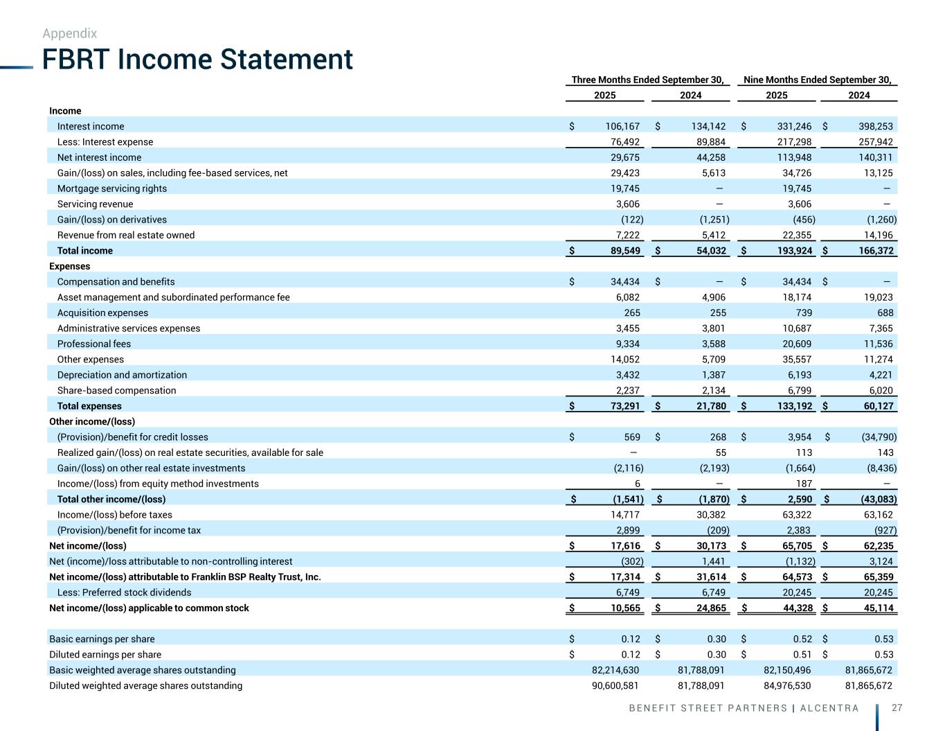 B E N E F I T S T R E E T P A R T N E R S | A L C E N T R A 27 Three Months Ended September 30, Nine Months Ended September 30, 2025 2024 2025 2024 Income Interest income $ 106,167 $ 134,142 $ 331,246 $ 398,253 Less: Interest expense 76,492 89,884 217,298 257,942 Net interest income 29,675 44,258 113,948 140,311 Gain/(loss) on sales, including fee-based services, net 29,423 5,613 34,726 13,125 Mortgage servicing rights 19,745 — 19,745 — Servicing revenue 3,606 — 3,606 — Gain/(loss) on derivatives (122) (1,251) (456) (1,260) Revenue from real estate owned 7,222 5,412 22,355 14,196 Total income $ 89,549 $ 54,032 $ 193,924 $ 166,372 Expenses Compensation and benefits $ 34,434 $ — $ 34,434 $ — Asset management and subordinated performance fee 6,082 4,906 18,174 19,023 Acquisition expenses 265 255 739 688 Administrative services expenses 3,455 3,801 10,687 7,365 Professional fees 9,334 3,588 20,609 11,536 Other expenses 14,052 5,709 35,557 11,274 Depreciation and amortization 3,432 1,387 6,193 4,221 Share-based compensation 2,237 2,134 6,799 6,020 Total expenses $ 73,291 $ 21,780 $ 133,192 $ 60,127 Other income/(loss) (Provision)/benefit for credit losses $ 569 $ 268 $ 3,954 $ (34,790) Realized gain/(loss) on real estate securities, available for sale — 55 113 143 Gain/(loss) on other real estate investments (2,116) (2,193) (1,664) (8,436) Income/(loss) from equity method investments 6 — 187 — Total other income/(loss) $ (1,541) $ (1,870) $ 2,590 $ (43,083) Income/(loss) before taxes 14,717 30,382 63,322 63,162 (Provision)/benefit for income tax 2,899,, (209) 2,383.. (927) Net income/(loss) $ 17,616 $ 30,173 $ 65,705 $ 62,235 Net (income)/loss attributable to non-controlling interest (302) 1,441 (1,132) 3,124 Net income/(loss) attributable to Franklin BSP Realty Trust, Inc. $ 17,314 $ 31,614 $ 64,573 $ 65,359 Less: Preferred stock dividends 6,749 6,749 20,245 20,245 Net income/(loss) applicable to common stock $ 10,565 $ 24,865 $ 44,328. $ 45,114 Basic earnings per share $ 0.12 $ 0.30 $ 0.52 $ 0.53 Diluted earnings per share $ 0.12 $ 0.30 $ 0.51 $ 0.53 Basic weighted average shares outstanding 82,214,630 81,788,091 82,150,496 81,865,672 Diluted weighted average shares outstanding 90,600,581 81,788,091 84,976,530 81,865,672 FBRT Income Statement Appendix