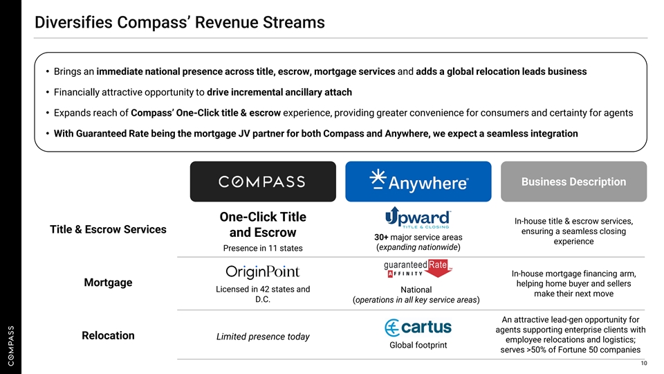 Expands Compass’ Footprint and International Network Pro Forma U.S. Footprint ● Combination establishes an expanded U.S. presence, covering all 50 states ● Transaction accelerates international expansion, with a franchise presence in approximately 120 countries and territories ● Significantly increases existing franchise network Incremental Footprint with Anywhere Compass Current ● Further unlocks agent-to-agent client referral opportunities in key US markets 50 countries and international territories ~120 countries and territories and territories in Compass’ pro forma network today 9