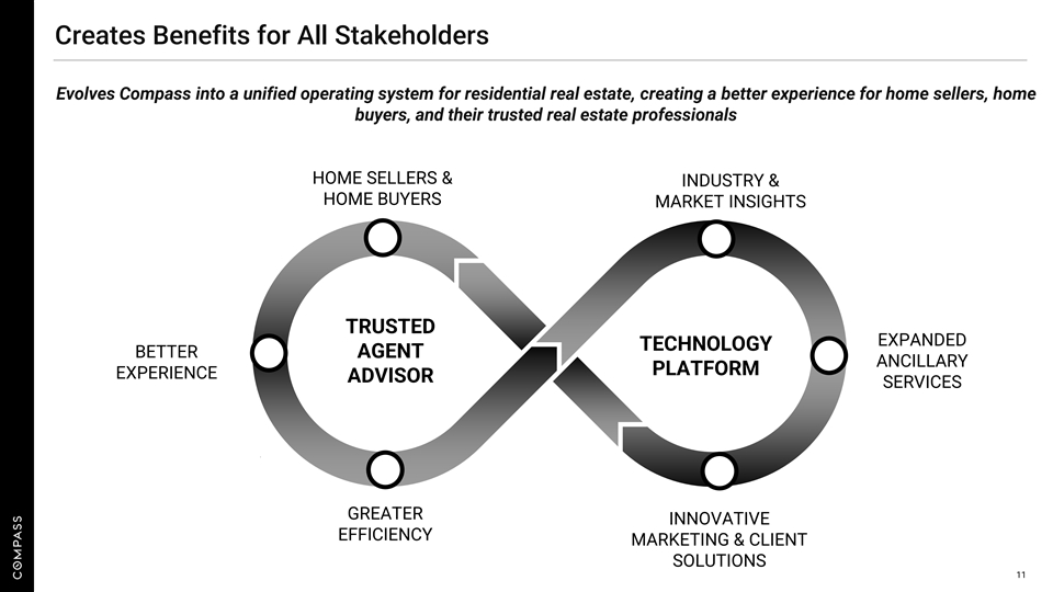 Diversifies Compass’ Revenue Streams • Brings an immediate national presence across title, escrow, mortgage services and adds a global relocation leads business • Financially attractive opportunity to drive incremental ancillary attach • Expands reach of Compass’ One-Click title & escrow experience, providing greater convenience for consumers and certainty for agents • With Guaranteed Rate being the mortgage JV partner for both Compass and Anywhere, we expect a seamless integration Business Description One-Click Title In-house title & escrow services, Title & Escrow Services ensuring a seamless closing and Escrow 30+ major service areas experience (expanding nationwide) Presence in 11 states In-house mortgage financing arm, Mortgage helping home buyer and sellers Licensed in 42 states and National make their next move D.C. (operations in all key service areas) An attractive lead-gen opportunity for agents supporting enterprise clients with Relocation Limited presence today employee relocations and logistics; Global footprint serves >50% of Fortune 50 companies 10