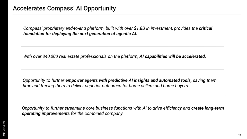 Creates Benefits for All Stakeholders Evolves Compass into a unified operating system for residential real estate, creating a better experience for home sellers, home buyers, and their trusted real estate professionals HOME SELLERS & INDUSTRY & HOME BUYERS MARKET INSIGHTS TRUSTED EXPANDED TECHNOLOGY BETTER AGENT ANCILLARY PLATFORM EXPERIENCE ADVISOR SERVICES GREATER INNOVATIVE EFFICIENCY MARKETING & CLIENT SOLUTIONS 11