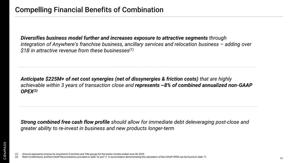 Accelerates Compass’ AI Opportunity Compass' proprietary end-to-end platform, built with over $1.8B in investment, provides the critical foundation for deploying the next generation of agentic AI. With over 340,000 real estate professionals on the platform, AI capabilities will be accelerated. Opportunity to further empower agents with predictive AI insights and automated tools, saving them time and freeing them to deliver superior outcomes for home sellers and home buyers. Opportunity to further streamline core business functions with AI to drive efficiency and create long-term operating improvements for the combined company. 12