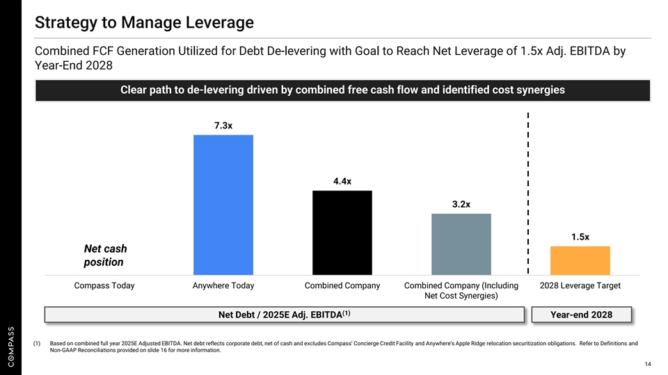 Compelling Financial Benefits of Combination Diversifies business model further and increases exposure to attractive segments through integration of Anywhere’s franchise business, ancillary services and relocation business – adding over (1) $1B in attractive revenue from these businesses Anticipate $225M+ of net cost synergies (net of dissynergies & friction costs) that are highly achievable within 3 years of transaction close and represents ~8% of combined annualized non-GAAP (2) OPEX Strong combined free cash flow profile should allow for immediate debt deleveraging post-close and greater ability to re-invest in business and new products longer-term (1) Amount represents revenue for Anywhere's Franchise and Title groups for the twelve months ended June 30, 2025. (2) Refer to Definitions and Non-GAAP Reconciliations provided on slide 16 and 17. A reconciliation demonstrating the calculation of Non-GAAP OPEX can be found on slide 17. 13