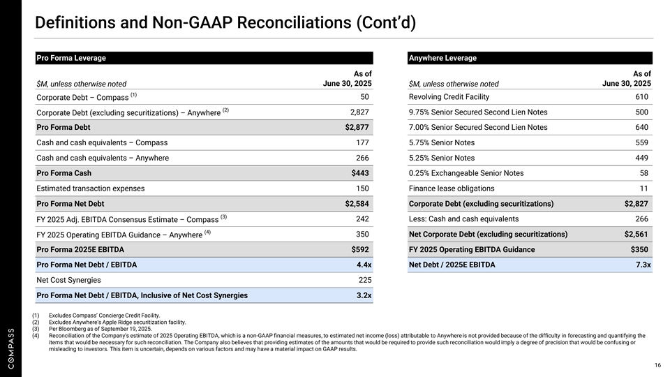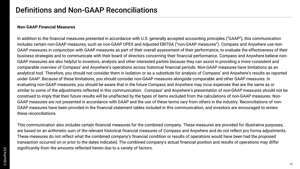 Definitions and Non-GAAP Reconciliations Non-GAAP Financial Measures In addition to the financial measures presented in accordance with U.S. generally accepted accounting principles (“GAAP”), this communication includes certain non-GAAP measures, such as non-GAAP OPEX and Adjusted EBITDA (“non-GAAP measures”). Compass and Anywhere use non- GAAP measures in conjunction with GAAP measures as part of their overall assessment of their performance, to evaluate the effectiveness of their business strategies and to communicate with their board of directors concerning their financial performance. Compass and Anywhere believe non- GAAP measures are also helpful to investors, analysts and other interested parties because they can assist in providing a more consistent and comparable overview of Compass’ and Anywhere’s operations across historical financial periods. Non-GAAP measures have limitations as an analytical tool. Therefore, you should not consider them in isolation or as a substitute for analysis of Compass’ and Anywhere’s results as reported under GAAP. Because of these limitations, you should consider non-GAAP measures alongside comparable and other GAAP measures. In evaluating non-GAAP measures, you should be aware that in the future Compass and Anywhere may incur expenses that are the same as or similar to some of the adjustments reflected in this communication. Compass’ and Anywhere’s presentation of non-GAAP measures should not be construed to imply that their future results will be unaffected by the types of items excluded from the calculations of non-GAAP measures. Non- GAAP measures are not presented in accordance with GAAP and the use of these terms vary from others in the industry. Reconciliations of non- GAAP measures have been provided in the financial statement tables included in this communication, and investors are encouraged to review these reconciliations. This communication also includes certain financial measures for the combined company. These measures are provided for illustrative purposes, are based on an arithmetic sum of the relevant historical financial measures of Compass and Anywhere and do not reflect pro forma adjustments. These measures do not reflect what the combined company’s financial condition or results of operations would have been had the proposed transaction occurred on or prior to the dates indicated. The combined company’s actual financial position and results of operations may differ significantly from the amounts reflected herein due to a variety of factors. 15