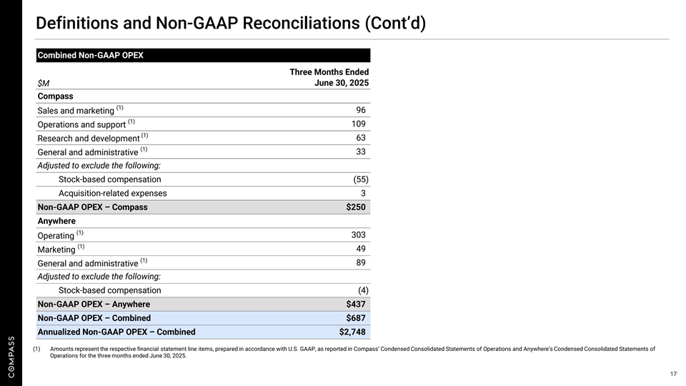 Definitions and Non-GAAP Reconciliations (Cont’d) Pro Forma Leverage Anywhere Leverage As of As of $M, unless otherwise noted June 30, 2025 $M, unless otherwise noted June 30, 2025 (1) 50 Revolving Credit Facility 610 Corporate Debt – Compass (2) 2,827 9.75% Senior Secured Second Lien Notes 500 Corporate Debt (excluding securitizations) – Anywhere Pro Forma Debt $2,877 7.00% Senior Secured Second Lien Notes 640 Cash and cash equivalents – Compass 177 5.75% Senior Notes 559 Cash and cash equivalents – Anywhere 266 5.25% Senior Notes 449 Pro Forma Cash $443 0.25% Exchangeable Senior Notes 58 Estimated transaction expenses 150 Finance lease obligations 11 Pro Forma Net Debt $2,584 Corporate Debt (excluding securitizations) $2,827 (3) 242 Less: Cash and cash equivalents 266 FY 2025 Adj. EBITDA Consensus Estimate – Compass (4) FY 2025 Operating EBITDA Guidance – Anywhere 350 Net Corporate Debt (excluding securitizations) $2,561 Pro Forma 2025E EBITDA $592 FY 2025 Operating EBITDA Guidance $350 Pro Forma Net Debt / EBITDA 4.4x Net Debt / 2025E EBITDA 7.3x Net Cost Synergies 225 Pro Forma Net Debt / EBITDA, Inclusive of Net Cost Synergies 3.2x (1) Excludes Compass’ Concierge Credit Facility. (2) Excludes Anywhere’s Apple Ridge securitization facility. (3) Per Bloomberg as of September 19, 2025. (4) Reconciliation of the Company's estimate of 2025 Operating EBITDA, which is a non-GAAP financial measures, to estimated net income (loss) attributable to Anywhere is not provided because of the difficulty in forecasting and quantifying the items that would be necessary for such reconciliation. The Company also believes that providing estimates of the amounts that would be required to provide such reconciliation would imply a degree of precision that would be confusing or misleading to investors. This item is uncertain, depends on various factors and may have a material impact on GAAP results. 16