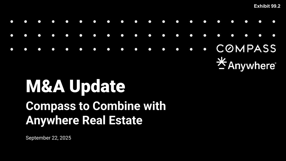 Important Information about the Transaction and Where to Find It In connection with the proposed transaction between Anywhere Real Estate Inc. (“Anywhere”) and Compass, Inc. (“Compass”), Anywhere and Compass will file relevant materials with the SEC, including a registration statement on Form S-4 filed by Compass (the “Registration Statement”) that will include a joint proxy statement of Compass and Anywhere that also constitutes a prospectus of Compass (the “Joint Proxy Statement/Prospectus”). The definitive Joint Proxy Statement/Prospectus will be mailed to stockholders of Anywhere and stockholders of Compass seeking their approval of the proposed transaction and other related matters. Each of Anywhere and Compass may also file other relevant documents with the SEC regarding the proposed transaction. This communication is not a substitute for the Registration Statement, Joint Proxy Statement/Prospectus or any other document that Anywhere or Compass (as applicable) may file with the SEC in connection with the proposed transaction. BEFORE MAKING ANY VOTING OR INVESTMENT DECISION, INVESTORS AND SECURITY HOLDERS OF COMPASS AND ANYWHERE ARE URGED TO READ THE REGISTRATION STATEMENT, THE JOINT PROXY STATEMENT/PROSPECTUS AND ANY OTHER RELEVANT DOCUMENTS THAT ARE FILED OR WILL BE FILED WITH THE SEC, AS WELL AS ANY AMENDMENTS OR SUPPLEMENTS TO THESE DOCUMENTS, CAREFULLY AND IN THEIR ENTIRETY WHEN THEY BECOME AVAILABLE BECAUSE THEY CONTAIN OR WILL CONTAIN IMPORTANT INFORMATION ABOUT THE PROPOSED TRANSACTION AND RELATED MATTERS. Investors and security holders may obtain free copies of the Registration Statement and the Joint Proxy Statement/Prospectus (when they become available), as well as other filings containing important information about Anywhere or Compass, without charge at the SEC’s Internet website (http://www.sec.gov). Copies of the documents filed with the SEC by Anywhere will be available free of charge on Anywhere’s internet website at https://ir.anywhere.re/financials/sec-filings/default.aspx or by contacting Anywhere’s investor relations contact at investor.relations@anywhere.re. Copies of the documents filed with the SEC by Compass will be available free of charge on Compass’ internet website at https://investors.compass.com/financials/sec-filings/default.aspx or by contacting Compass’ investor relations contact at investorrelations@compass.com. The information included on or accessible through Anywhere’s website or Compass’ website is not incorporated by reference into this communication. Participants in the Solicitation Anywhere, Compass, their respective directors, and certain of their respective executive officers may be deemed to be participants in the solicitation of proxies in respect of the proposed transaction. Information about the directors and executive officers of Anywhere is set forth in its proxy statement for its 2025 annual meeting of stockholders, which was filed with the SEC on March 24, 2025 (the “Anywhere Annual Meeting Proxy Statement”) and in its Form 8-K, which was filed with the SEC on May 7, 2025. Please refer to the sections captioned “Compensation of Independent Directors,” “Independent Director Stock Ownership Guidelines,” “Ownership of our Common Stock” and “Executive Compensation” in the Anywhere Annual Meeting Proxy Statement. To the extent holdings of such participants in Anywhere’s securities have changed since the amounts described in the Anywhere Annual Meeting Proxy Statement, such changes have been reflected on Initial Statements of Beneficial Ownership on Form 3 or Statements of Change in Ownership on Form 4 filed with the SEC, which are available at https://www.sec.gov/cgi-bin/browse-edgar?CIK=0001398987&owner=only. Information about the directors and executive officers of Compass is set forth in its proxy statement for its 2025 annual meeting of stockholders, which was filed with the SEC on April 4, 2025 (the “Compass Annual Meeting Proxy Statement”) and in its Form 8-Ks, which were filed with the SEC on May 29, 2025, July 30, 2025 and September 9, 2025. Please refer to the sections captioned “Security Ownership of Certain Beneficial Owners and Management” and “Compensation Tables” in the Compass Annual Meeting Proxy Statement. To the extent holdings of such participants in Compass’ securities have changed since the amounts described in the Compass Annual Meeting Proxy Statement, such changes have been reflected on Initial Statements of Beneficial Ownership on Form 3 or Statements of Change in Ownership on Form 4 filed with the SEC, which are available at https://www.sec.gov/cgi-bin/browse- edgar?CIK=0001563190&owner=only . These documents can be obtained free of charge from the sources indicated above. Additional information regarding the participants in the proxy solicitations and a description of their direct or indirect interests, by security holdings or otherwise, will be contained in the Registration Statement, the Joint Proxy Statement/Prospectus and the other relevant materials filed with the SEC when they become available. No Offer or Solicitation This communication is for informational purposes only and is not intended to, and shall not, constitute an offer to sell or the solicitation of an offer to buy any securities or a solicitation of any vote or approval, nor shall there be any offer, solicitation or sale of securities in any jurisdiction in which such offer, solicitation or sale would be unlawful prior to registration or qualification under the securities laws of any such jurisdiction. No offering of securities shall be made except by means of a prospectus meeting the requirements of Section 10 of the U.S. Securities Act of 1933, as amended. 2