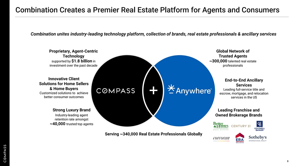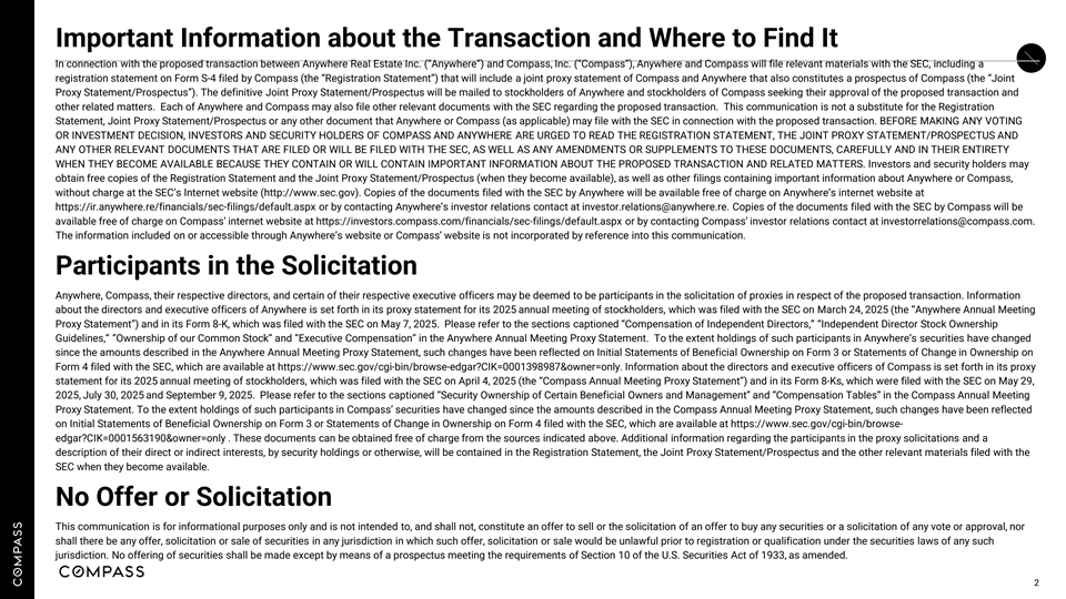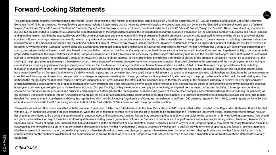 Forward-Looking Statements This communication contains “forward-looking statements” within the meaning of the federal securities laws, including Section 27A of the Securities Act of 1933, as amended, and Section 21E of the Securities Exchange Act of 1934, as amended. Forward-looking statements include all statements that do not relate solely to historical or current facts, and can generally be identified by the use of words such as “believe,” “expect,” “anticipate,” “intend,” “project,” “estimate,” “potential,” “plan,” and similar expressions or future or conditional verbs such as “will,” “should,” “would,” “may” and “could.” These forward-looking statements include, but are not limited to, statements related to the expected benefits of the proposed transaction; the anticipated impact of the proposed transaction on the combined company’s business and future financial and operating results, including the expected leverage of the combined company and the amount and timing of synergies from the proposed transaction; the expected timeline; and the ability to satisfy all closing conditions. Forward-looking statements inherently involve many risks and uncertainties that could cause actual results to differ materially from those projected in these statements, including statements about the consummation of the proposed transaction and the anticipated benefits thereof. Where, in any forward-looking statement, Anywhere or Compass express an expectation or belief as to future results or events, it is based on Anywhere’s and/or Compass’ current plans and expectations, expressed in good faith and believed to have a reasonable basis. However, neither Anywhere nor Compass can give any assurance that any such expectation or belief will result or will be achieved or accomplished. Important risk factors that may cause such a difference include, but are not limited to: Compass’ and Anywhere’s ability to consummate the proposed transaction on the expected timeline or at all; Compass’ and Anywhere’s ability to obtain the necessary regulatory approval in a timely manner and the risk that such approval is not obtained or is obtained subject to conditions that are not anticipated; Compass’ or Anywhere’s ability to obtain approval of the stockholders; the risk that a condition of closing of the proposed transaction may not be satisfied or that the closing of the proposed transaction might otherwise not occur; the occurrence of any event, change or other circumstance or condition that could give rise to the termination of the merger agreement, including in circumstances requiring Anywhere or Compass to pay a termination fee; the diversion of management time on transaction-related issues; risks related to disruption from the proposed transaction, including disruption of management time from current plans and ongoing business operations due to the proposed transaction and integration matters; the risk that the proposed transaction and its announcement could have an adverse effect on Compass’ and Anywhere’s ability to retain agents and personnel or that there could be potential adverse reactions or changes to business relationships resulting from the announcement or completion of the proposed transaction; unexpected costs, charges or expenses resulting from the proposed transaction; potential litigation relating to the proposed transaction that could be instituted against the parties to the merger agreement or their respective directors, managers or officers, including the effects of any outcomes related thereto; the ability of the combined company to achieve the synergies and other anticipated benefits expected from the proposed transaction or such synergies and other anticipated benefits taking longer to realize than anticipated; the ability of the combined company to achieve the expected leverage or such leverage taking longer to realize than anticipated; Compass’ ability to integrate Anywhere promptly and effectively; anticipated tax treatment, unforeseen liabilities, future capital expenditures, economic performance, future prospects and business and management strategies for the management, expansion and growth of the combined company’s operations; certain restrictions during the pendency of the proposed transaction that may impact Anywhere’s or Compass’ ability to pursue certain business opportunities or strategic transactions or otherwise operate their respective businesses; and other risk factors detailed from time to time in Anywhere’s and Compass’ reports filed with the SEC, including Anywhere’s and Compass’ annual reports on Form 10-K, quarterly reports on Form 10-Q, current reports on Form 8-K and other documents filed with the SEC, including documents that will be filed with the SEC in connection with the proposed transaction. These risks, as well as other risks associated with the proposed transaction, will be more fully discussed in the Joint Proxy Statement/Prospectus that will be included in the Registration Statement that will be filed with the SEC in connection with the proposed transaction. While the list of factors presented here is, and the list of factors to be presented in the Registration Statement will be, considered representative, no such list should be considered to be a complete statement of all potential risks and uncertainties. Unlisted factors may present significant additional obstacles to the realization of forward-looking statements. You should not place undue reliance on any of these forward-looking statements as they are not guarantees of future performance or outcomes; actual performance and outcomes, including, without limitation, Anywhere’s or Compass’ actual results of operations, financial condition and liquidity, and the development of new markets or market segments in which Anywhere or Compass operate, may differ materially from those made in or suggested by the forward-look