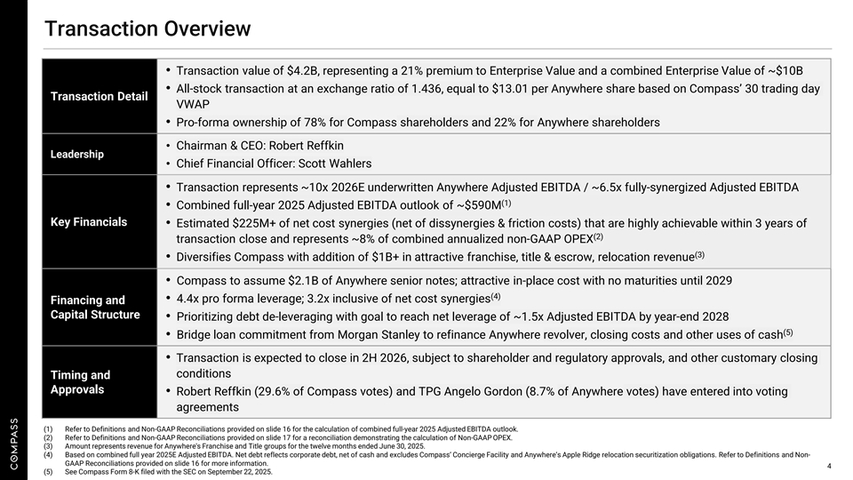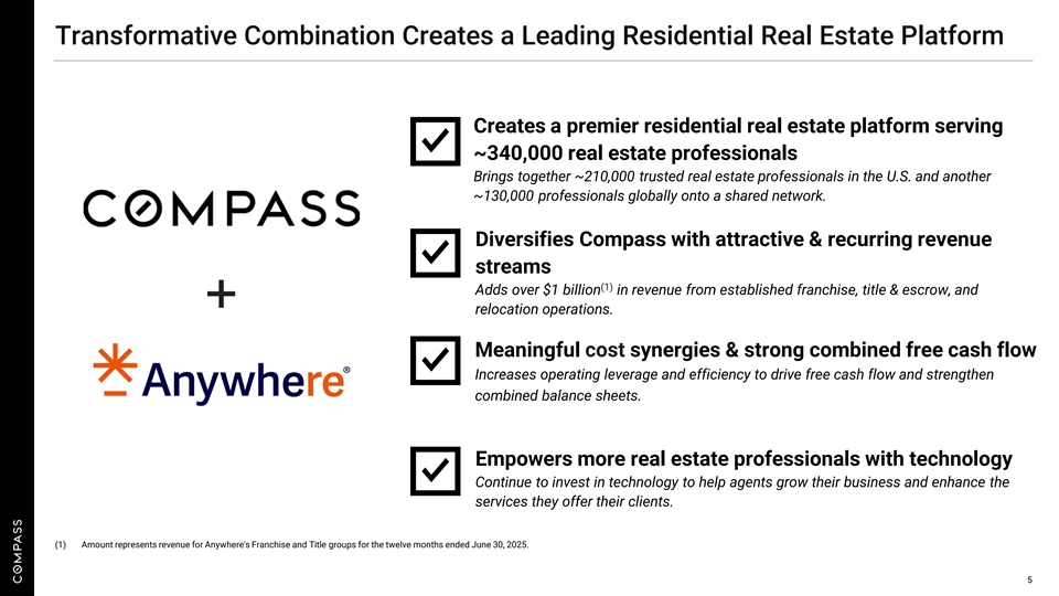 Transaction Overview • Transaction value of $4.2B, representing a 21% premium to Enterprise Value and a combined Enterprise Value of ~$10B • All-stock transaction at an exchange ratio of 1.436, equal to $13.01 per Anywhere share based on Compass’ 30 trading day Transaction Detail VWAP • Pro-forma ownership of 78% for Compass shareholders and 22% for Anywhere shareholders • Chairman & CEO: Robert Reffkin Leadership • Chief Financial Officer: Scott Wahlers • Transaction represents ~10x 2026E underwritten Anywhere Adjusted EBITDA / ~6.5x fully-synergized Adjusted EBITDA (1) • Combined full-year 2025 Adjusted EBITDA outlook of ~$590M Key Financials • Estimated $225M+ of net cost synergies (net of dissynergies & friction costs) that are highly achievable within 3 years of (2) transaction close and represents ~8% of combined annualized non-GAAP OPEX (3) • Diversifies Compass with addition of $1B+ in attractive franchise, title & escrow, relocation revenue • Compass to assume $2.1B of Anywhere senior notes; attractive in-place cost with no maturities until 2029 (4) • 4.4x pro forma leverage; 3.2x inclusive of net cost synergies Financing and Capital Structure • Prioritizing debt de-leveraging with goal to reach net leverage of ~1.5x Adjusted EBITDA by year-end 2028 (5) • Bridge loan commitment from Morgan Stanley to refinance Anywhere revolver, closing costs and other uses of cash • Transaction is expected to close in 2H 2026, subject to shareholder and regulatory approvals, and other customary closing conditions Timing and Approvals • Robert Reffkin (29.6% of Compass votes) and TPG Angelo Gordon (8.7% of Anywhere votes) have entered into voting agreements (1) Refer to Definitions and Non-GAAP Reconciliations provided on slide 16 for the calculation of combined full-year 2025 Adjusted EBITDA outlook. (2) Refer to Definitions and Non-GAAP Reconciliations provided on slide 17 for a reconciliation demonstrating the calculation of Non-GAAP OPEX. (3) Amount represents revenue for Anywhere's Franchise and Title groups for the twelve months ended June 30, 2025. (4) Based on combined full year 2025E Adjusted EBITDA. Net debt reflects corporate debt, net of cash and excludes Compass’ Concierge Facility and Anywhere’s Apple Ridge relocation securitization obligations. Refer to Definitions and Non- GAAP Reconciliations provided on slide 16 for more information. 4 (5) See Compass Form 8-K filed with the SEC on September 22, 2025.