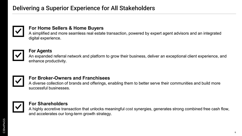 Transformative Combination Creates a Leading Residential Real Estate Platform Creates a premier residential real estate platform serving ~340,000 real estate professionals Brings together ~210,000 trusted real estate professionals in the U.S. and another ~130,000 professionals globally onto a shared network. Diversifies Compass with attractive & recurring revenue streams (1) Adds over $1 billion in revenue from established franchise, title & escrow, and + relocation operations. Meaningful cost synergies & strong combined free cash flow Increases operating leverage and efficiency to drive free cash flow and strengthen combined balance sheets. Empowers more real estate professionals with technology Continue to invest in technology to help agents grow their business and enhance the services they offer their clients. (1) Amount represents revenue for Anywhere's Franchise and Title groups for the twelve months ended June 30, 2025. 5