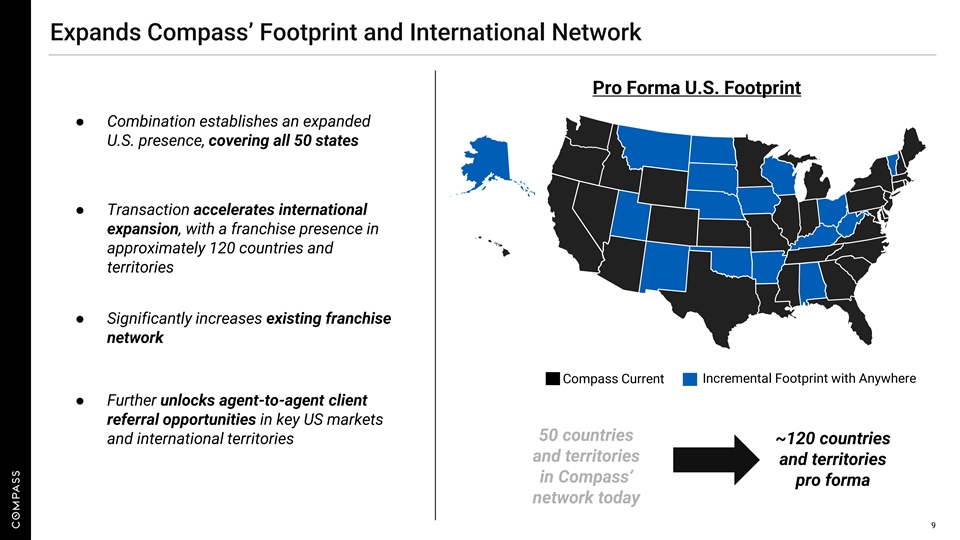 Combination Creates a Premier Real Estate Platform for Agents and Consumers Combination unites industry-leading technology platform, collection of brands, real estate professionals & ancillary services Proprietary, Agent-Centric Global Network of Trusted Agents Technology supported by $1.8 billion in ~300,000 talented real estate investment over the past decade professionals Innovative Client End-to-End Ancillary Solutions for Home Sellers Services & Home Buyers Leading full-service title and Customized solutions to achieve escrow, mortgage, and relocation + better consumer outcomes services in the US Strong Luxury Brand Leading Franchise and Industry-leading agent Owned Brokerage Brands retention rate amongst ~40,000 trusted top agents Serving ~340,000 Real Estate Professionals Globally 8